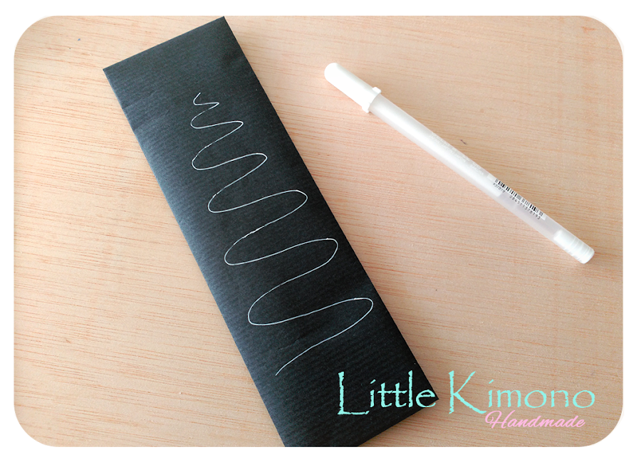 2. Con el rotulador blanco trazaremos una linea ondulada en zig-zag (de menos a más), éste será el cuerpo de nuestro abeto.