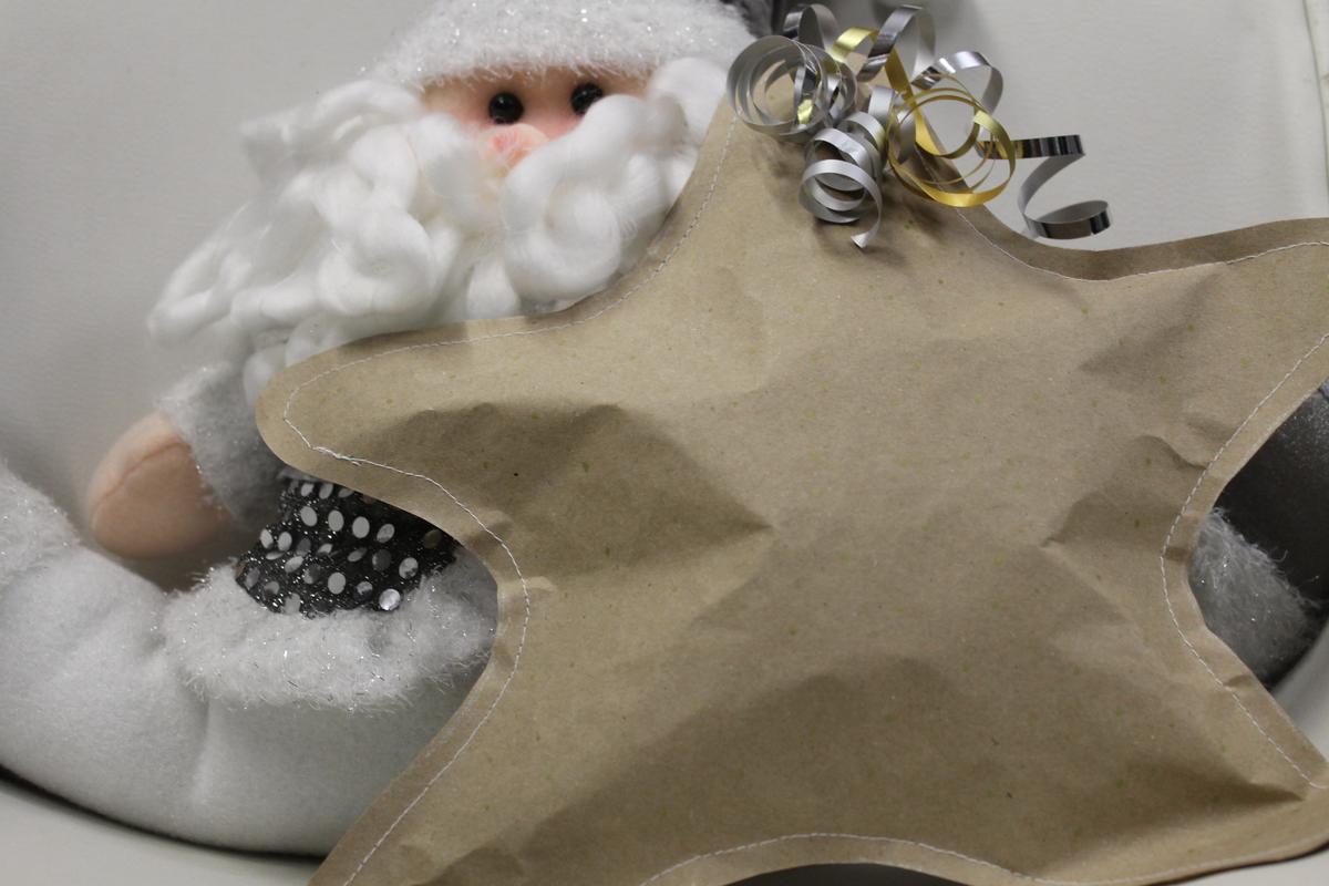 Te recomiendo marcar el tamaño del regalo en el papel. Ya que tienes la medida plasmada en el papel, dibuja la estrella, deja las puntas redondeadas, así te será mas fácil coserlas.