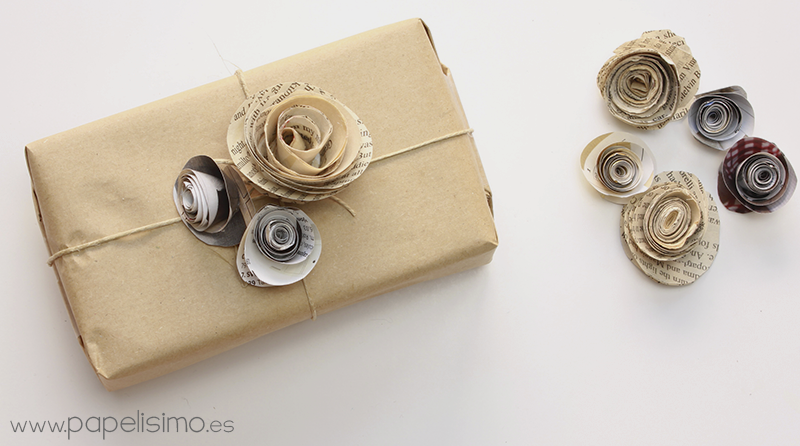Flores de papel “enrolladas” con papel de periódico o revista. Una bonita manera de reciclar y hacer un envoltorio de regalo original. Son muy fáciles de hacer, se consiguen enrollando una espiral de papel, puedes ver cómo se hacen aquí.