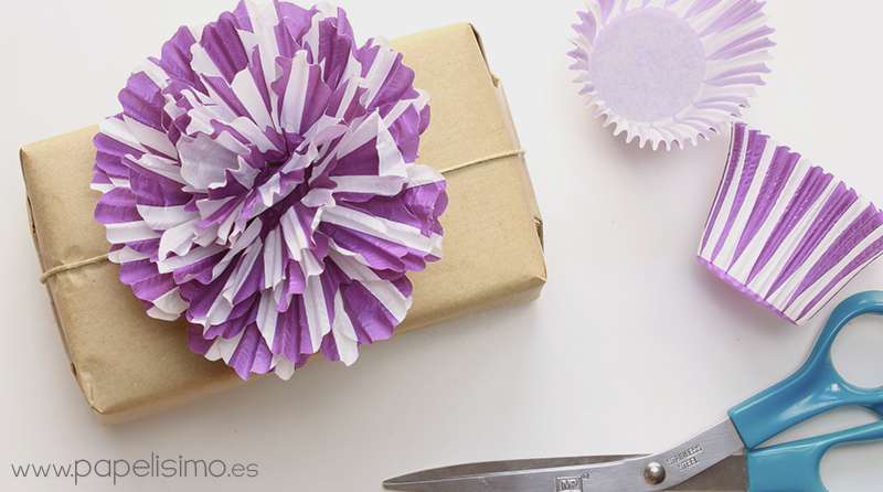 Flores con papel de cupcake. Recortando moldes de cupcakes (magdalenas de toda la vida) podemos hacer una flores-pompones para decorar nuestros envoltorios de regalo. Muy muy muy muy muy fácil de hacer. Mira el tutorial aquí.