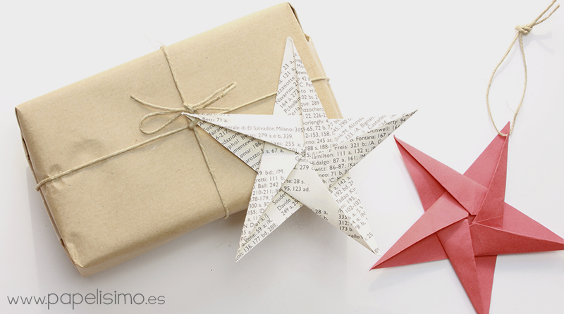 Lazos de papel para regalo estilo Froebel. Son estrellas de papel 3D que ya usamos para decorar el árbol de Navidad, pero si sólo hacemos media estrella, por uno de los lados quedará plano y se podrá usar como lazo para regalo. Mira el tutorial aquí.