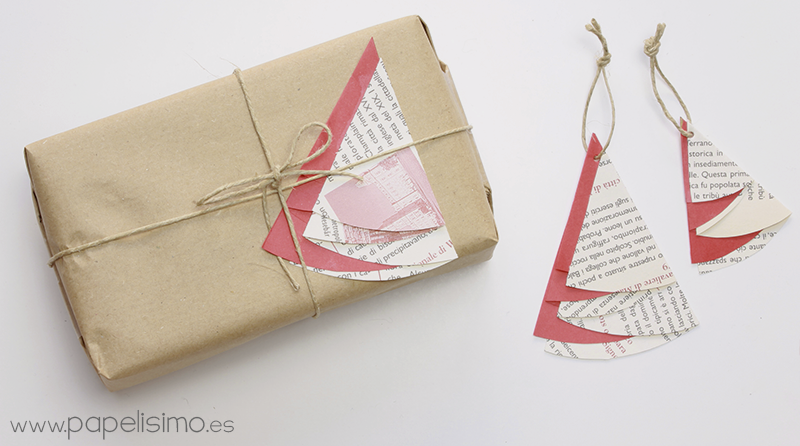 Árboles de Navidad con papel de periódico. Ya hemos usado estos árbolitos como adorno para colgar en el árbol y también para decorar tarjetas navideñas, podemos usarlos también como etiquetas en nuestros regalos. Mira el tutorial aquí.