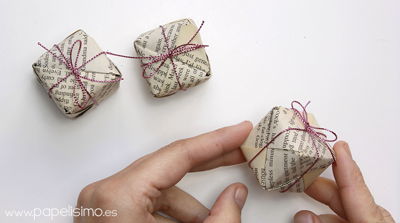 Si quieres hacer el envoltorio desde cero, prueba con estas cajitas de origami. Funcionan un poco como un puzzle, son 6 piezas iguales que encajan entre si, veremos si después de abrirlo son capaces de volver a armarlo. Mira el vídeo aquí.