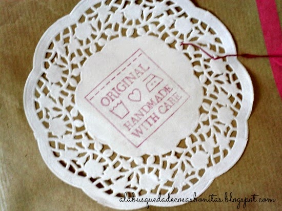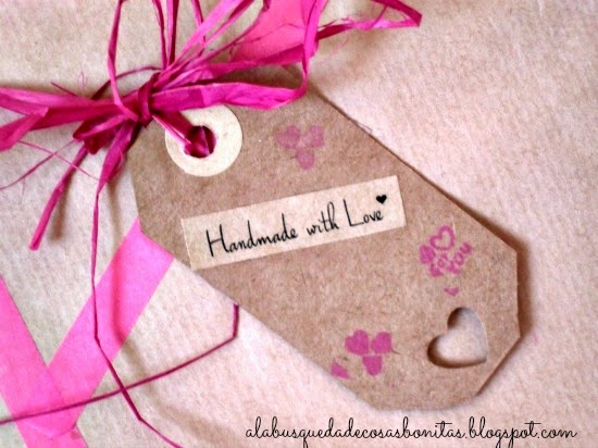 Una etiqueta también en color craft, con rafia rosa y más sellos fucsias...