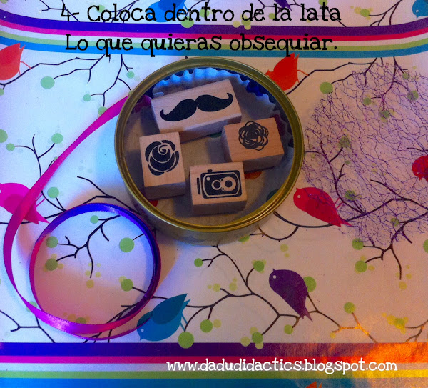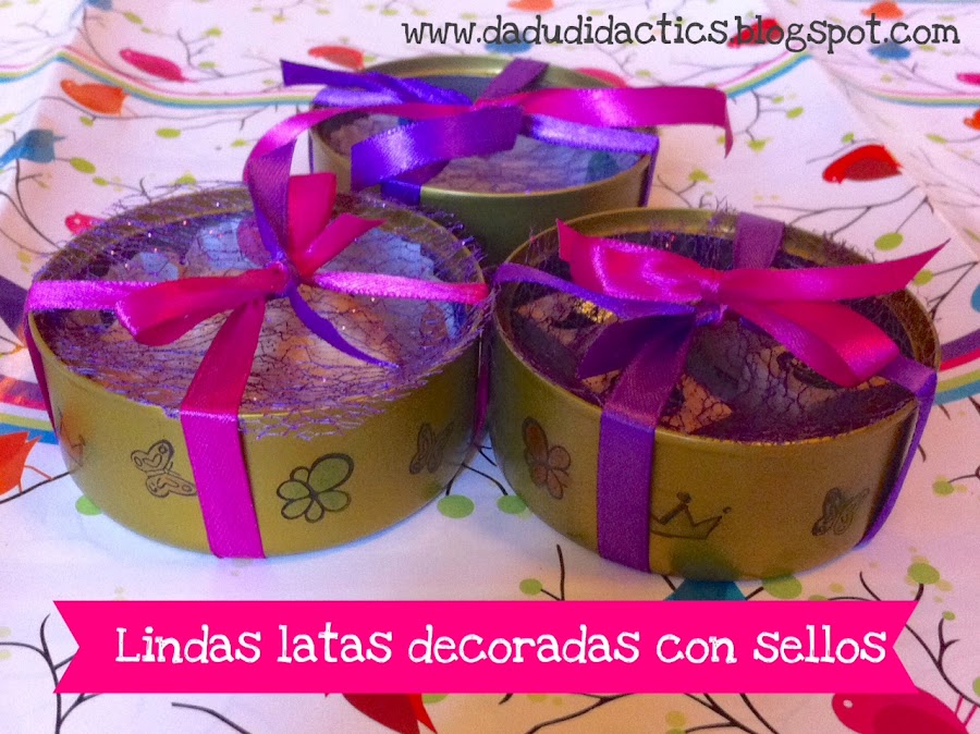 Llegó el momento de colocar nuestros obsequios dentro de las latas; a mi me encantó el tamaño para colocar sellitos, dulces para bolos, velitas "tea light", galletas y hasta lindos accesorios de bisutería o cualquier artículo de un tamaño adecuado.