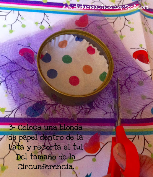 Ahora corta los retazos de tela o tul, del mismo diámetro de la boquilla de la lata, nos servirá para cubrirla como si fuera una tapadera.