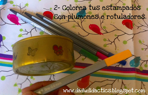 Una vez que los estampados en la lata se secaron, ya puedes comenzar a colorearlos con los plumones o rotuladores de tinta permanente. Yo utilicé unos sellos pequeños, y por ello elegí trabajar con rotuladores de punta fina.