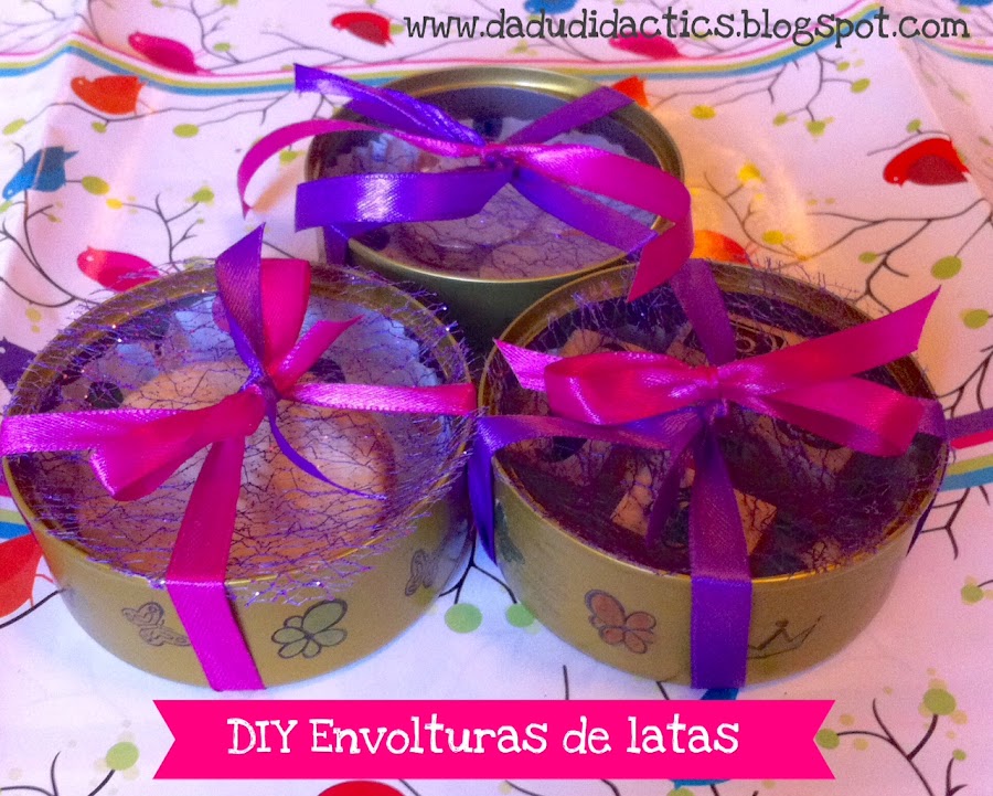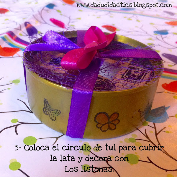Por último, solo es necesario colocar el tul sobre la boquilla de la lata y colocar los listones o lazos de colores para decorar y "cerrar" como si fuera una tapadera.
