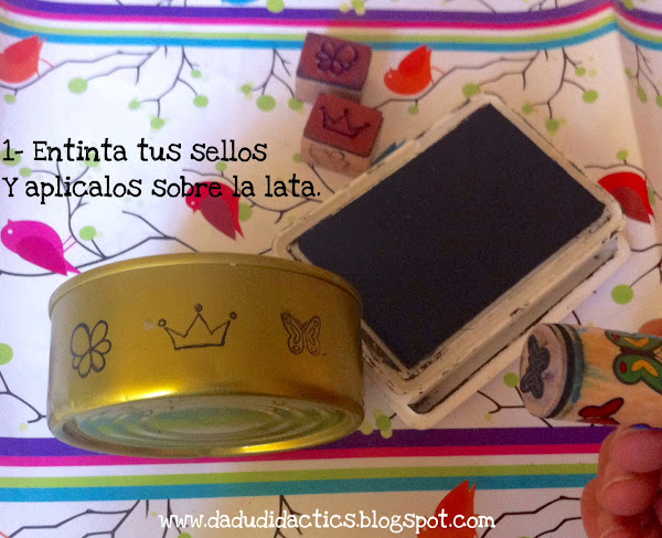 Primero, aplica tinta a tus sellos y estampa sobre la lata; cuida que tu tinta sea adecuada para estampar sobre metal, de lo contrario no se impregnará de forma adecuada y tardará en secar. Espera un par de minutos para que la tinta se seque y puedas continuar.