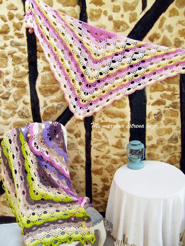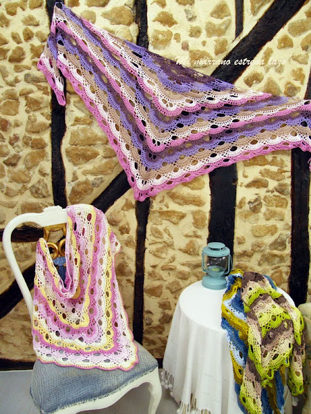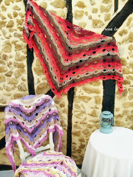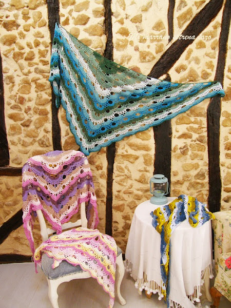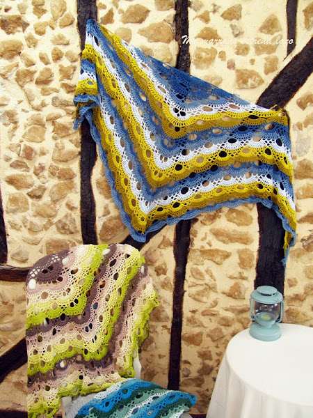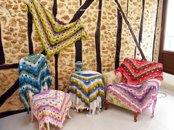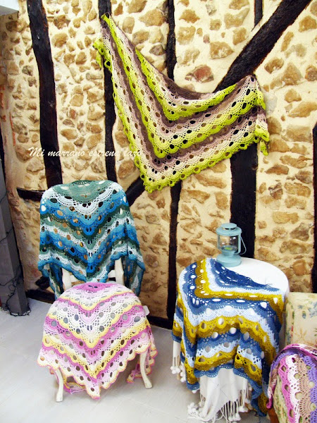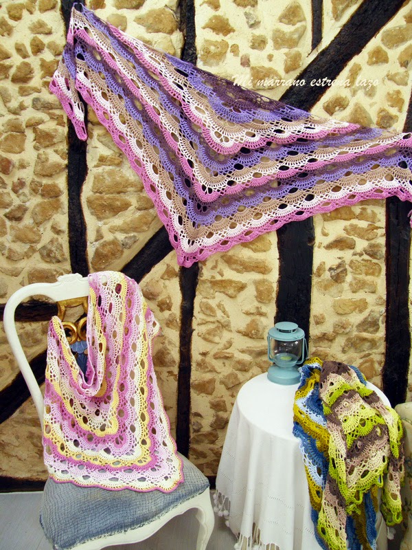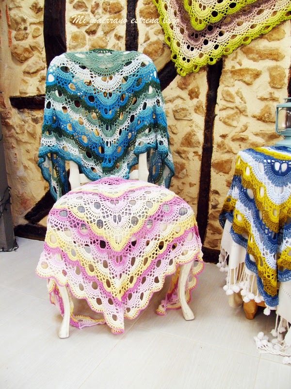 Me he divertido mucho haciéndolos y estaba deseando enseñároslos!!!! quedan geniales con los vestidos de verano, para llevarlos colgados del bolso y ponértelos cuando se levanta esa brisita al pasear por la playa, geniales para salir de noche,¿ y para ponerlos con unos vaqueros y una camiseta de tirantes? Te lo puedes poner como un chal, como una toquilla o como un pañuelo con el pico para delante, cuelgalo de tu capazo veraniego y triunfarás ;)