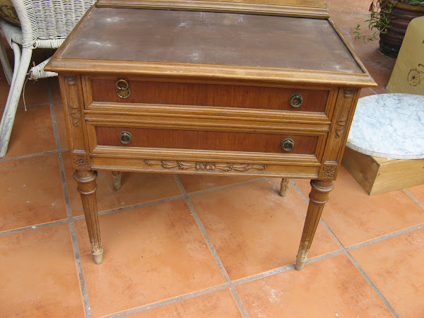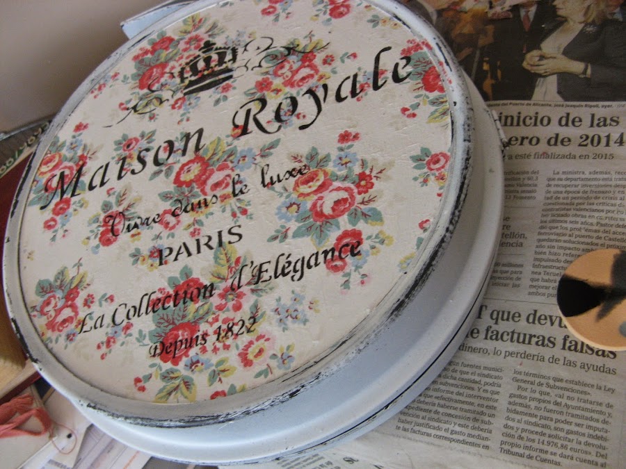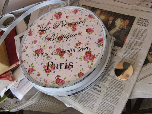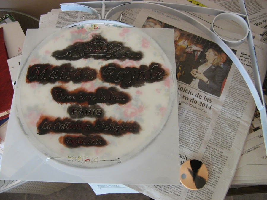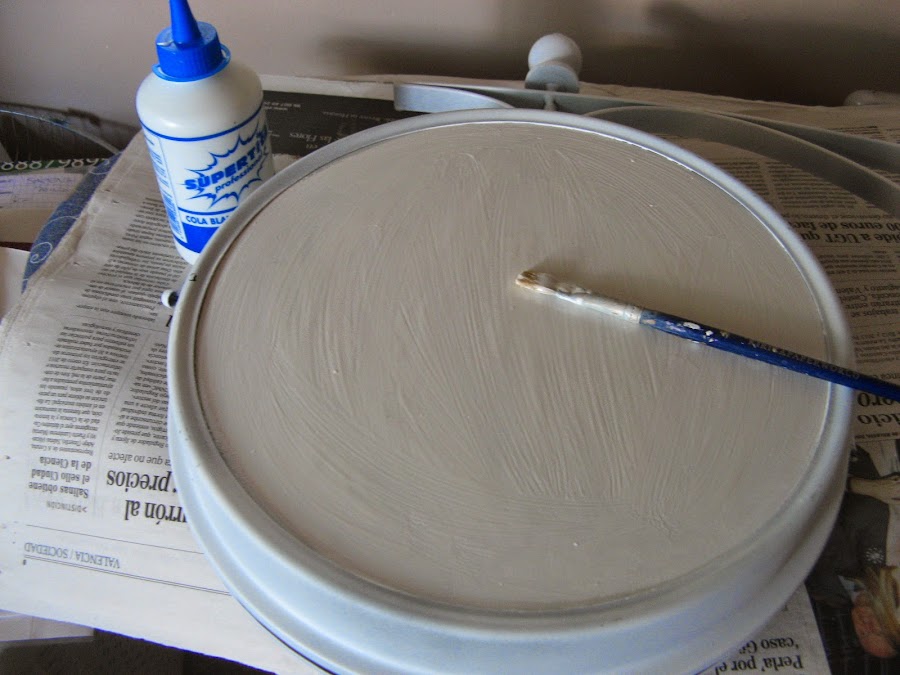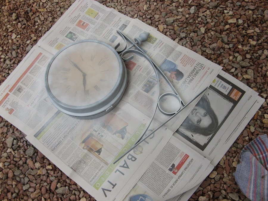 lo utilicé enterito insistiendo sobretodo en las partes metálicas......el cristal no me preocupaba tanto porque con una manita de pintura de acabado tiza iba a quedar bien. Como iba a llevar decoupage encima, no había ningún problema. El spray no cubrió del todo el metal pero ha quedado un tono grisáceo bonito