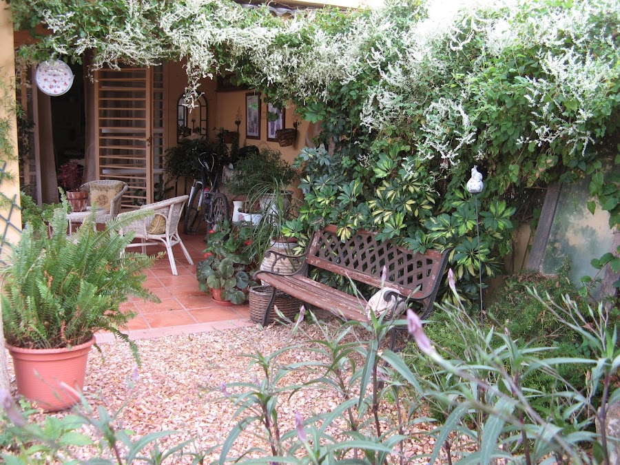 Mirad qué pasada de planta....se llama Polygonum o enredadera rusa....una bestia de planta preciosa. Ahora en plena floración ....dentro de nada perderá la hoja.......ya veis lo que voy a tener que barrer jaja