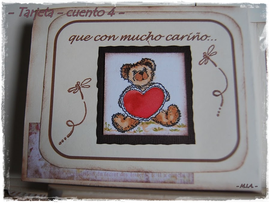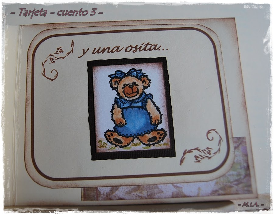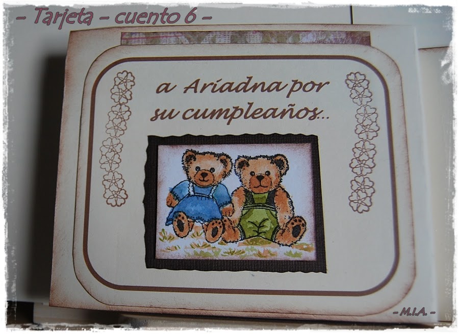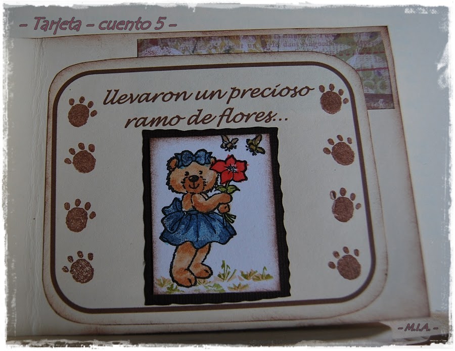 Los sellos están coloreados con tintas distress. Los adornos que he utilizado: lazo estrecho de color beig para el borde simulando la encuadernación, encaje con perlas y florecitas pequeñas simulando el ramo de flores.