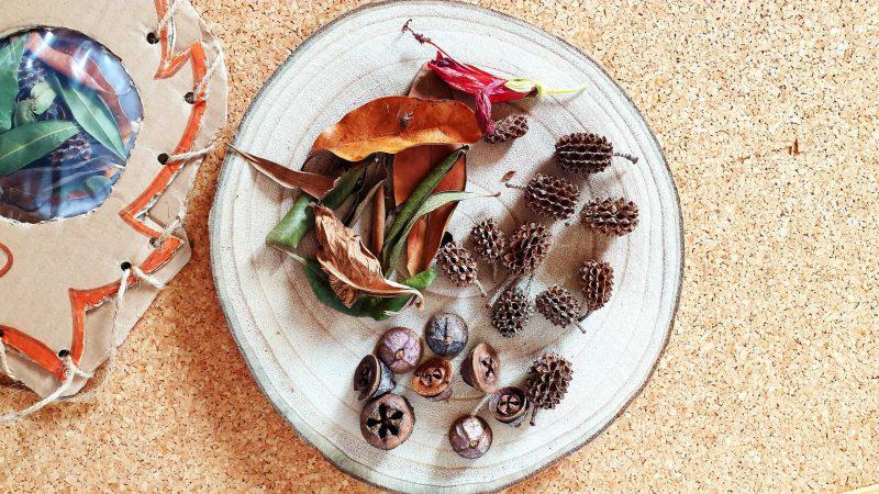Algunos de los materiales ya los tenía en casa y otros los cogimos del jardín de la escuela. La silueta del erizo lo hizo mi hija porque yo soy desastrosa a la hora de dibujar, lo hago todo con plantillas.