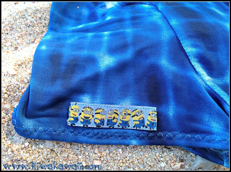 La tela de lycra, la cintura con FOE, el bajo dobladillo simple (lo remallé primero porque se me escurría la tela al intentar coser el dobladillo y así le di cuerpo), y una cinta de Minions para darle un toque divertido y de paso ayudar al peque a saber cuál es la parte delantera.