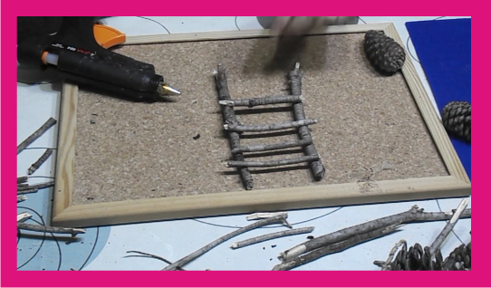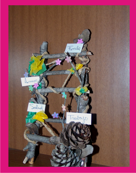 Cuando ya esta terminada la escalera solo buscaremos por casa cosas que podemos colocar para decorar, nosotras usamos ramitas secas finas, papel, hilo de papel, flores de plástico, flores de papel de seda y piñas pequeñas.