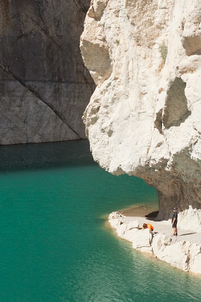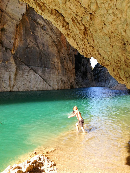 Finalmente decidimos bajar hasta el agua en algún lugar que fuera más o menos accesible y acabamos encontrando un lugar increíble, un poco por casualidad. Un camino en la roca se abría paso hasta el río y bajaba por él. Los cinco pompones que llevábamos tardaron menos en desnudarse que yo en acabar con un bote de Nutella y se lanzaron al agua sin pensárselo, entre gritos de sorpresa por la cantidad de peces que pasaban junto a ellos. Fue una tarde espectacular en uno de los sitios más bonitos que he visto, al que, evidentemente, las fotos no hacen justicia.