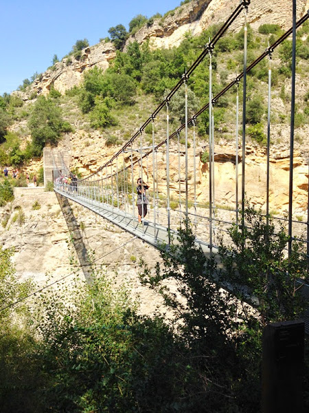 Delante tenía una de las cosas que más pánico me dan en la vida... un puente colgante, de esos de caída libre debajo, de esos en los que se ve la caída a través del suelo. No sé por qué no lloré, pero no fue por falta de ganas. El muy puñetero, además, se movía, y más todavía con el grupo de deportistas que se sacaban fotos encaramados a las barandillas. Yo estaba demasiado asustada para fulminarlos con la mirada, así que, cogida a la mano del pompón peque, que sufrió vértigo por simpatía, crucé como pude ante los vítores y aplausos de mis compañeros de excursión, que sospecho que eran más burlones que otra cosa.