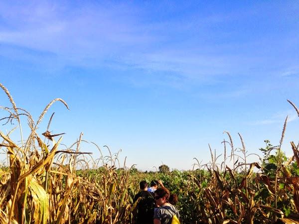 Con los sentidos un poco embotados por la comilona, nos fuimos al laberinto de maíz. Primero nos perdimos y dimos una interesante vuelta por los campos de maíz y de manzanos de Castellserà. Pero acabamos llegando a la plantación, que curiosamente era en una casa particular. El laberinto tenía dos kilómetros de caminos y un juego de pistas. Estábamos totalmente solos, así que nos dividimos en dos equipos (adultos contra pompones) y nos metimos en el maizal. Estaba un pelín seco porque el fin de semana que viene ya es el último (y organizan una fiesta de terror antes de la cosecha!) pero nos divertimos muchísimo corriendo camino arriba y camino abajo e intentando resolver los acertijos que había en los callejones sin salida.