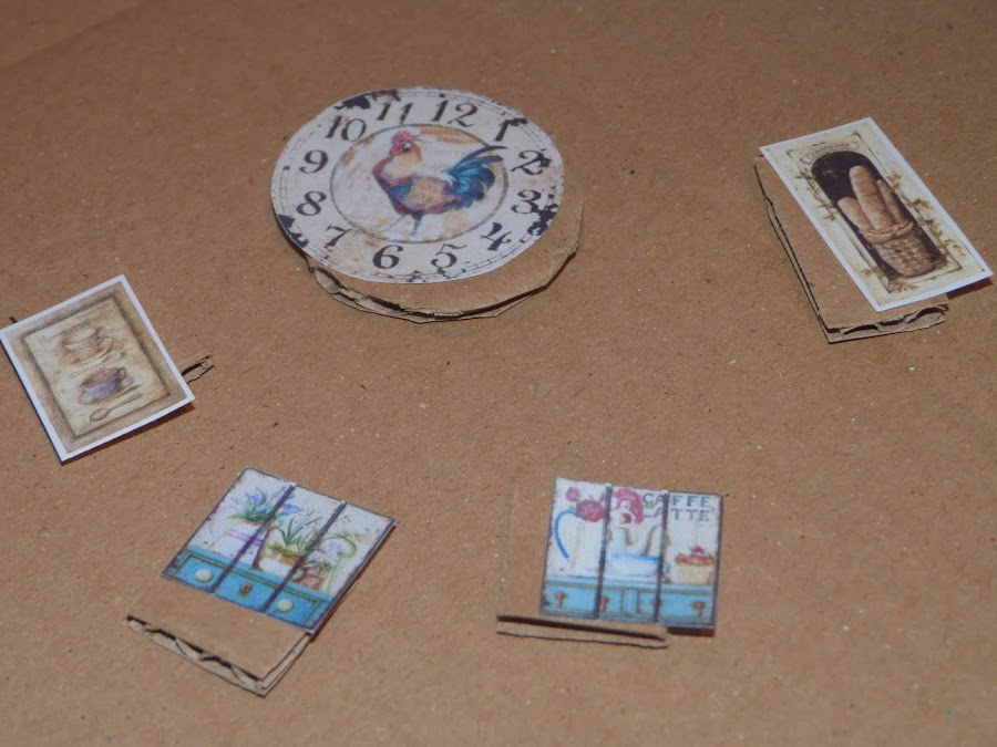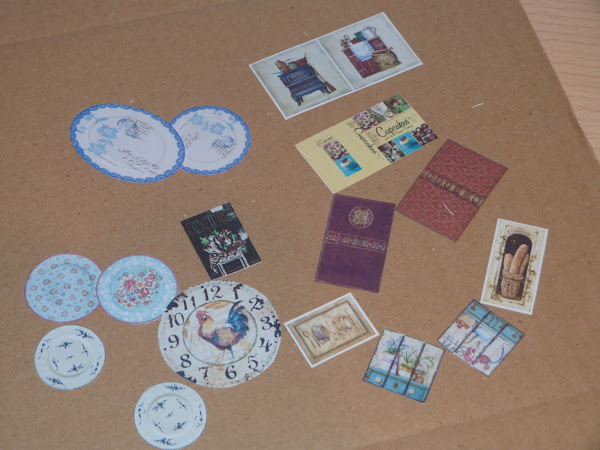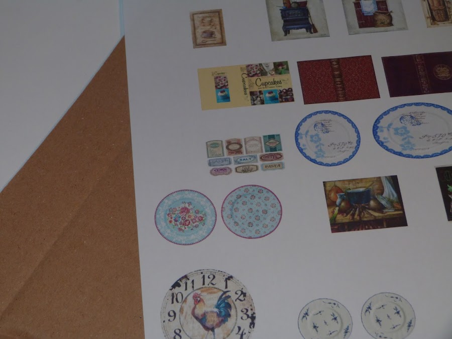 Lo primero que hice fue imprimir algunos de los accesorios que iba a necesitar: esfera de reloj, libros, cuadros, platos... en la red hay páginas de imprimibles de este tipo para descargar. También se puede utilizar cualquier imagen que nos guste y reducirla al tamaño deseado.