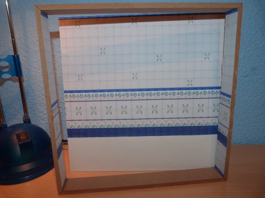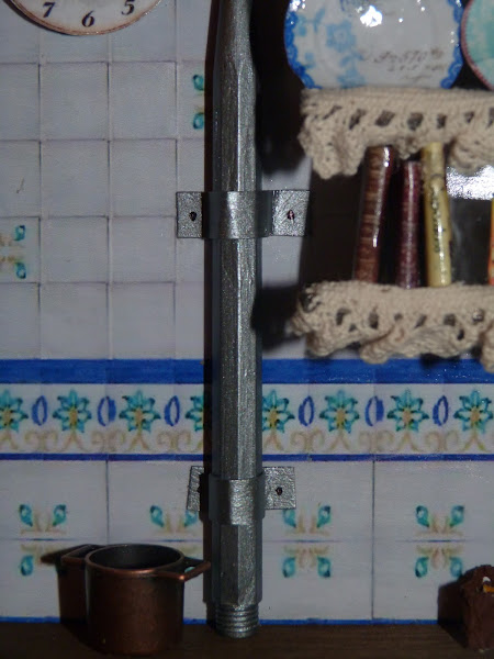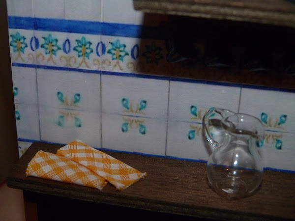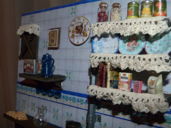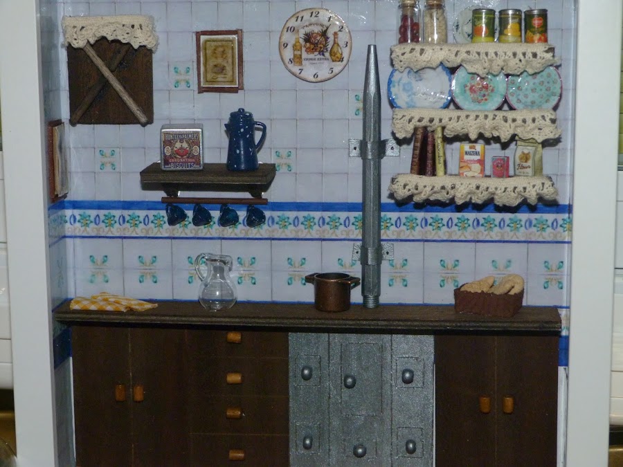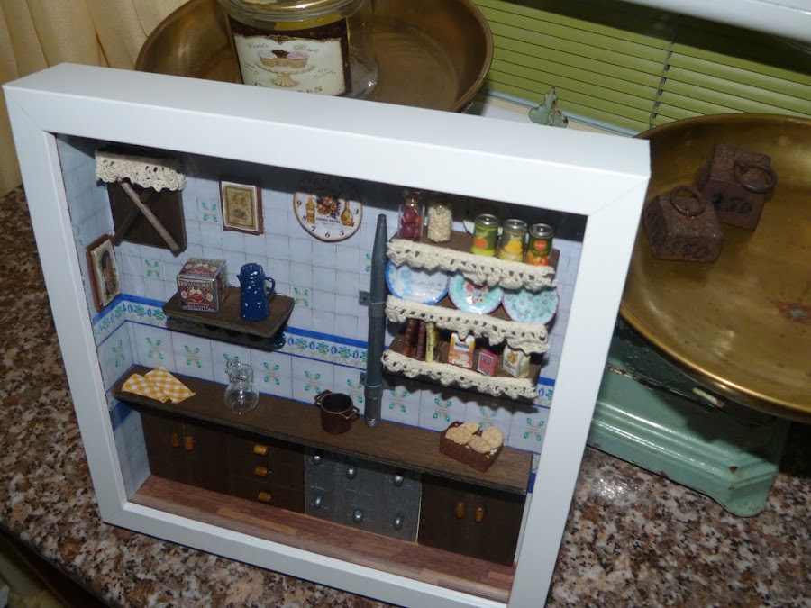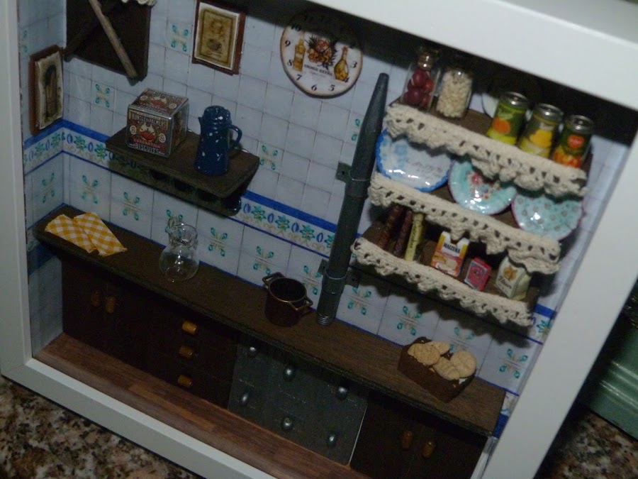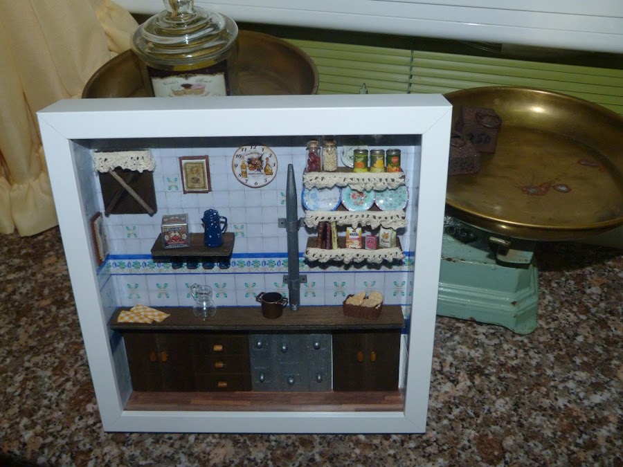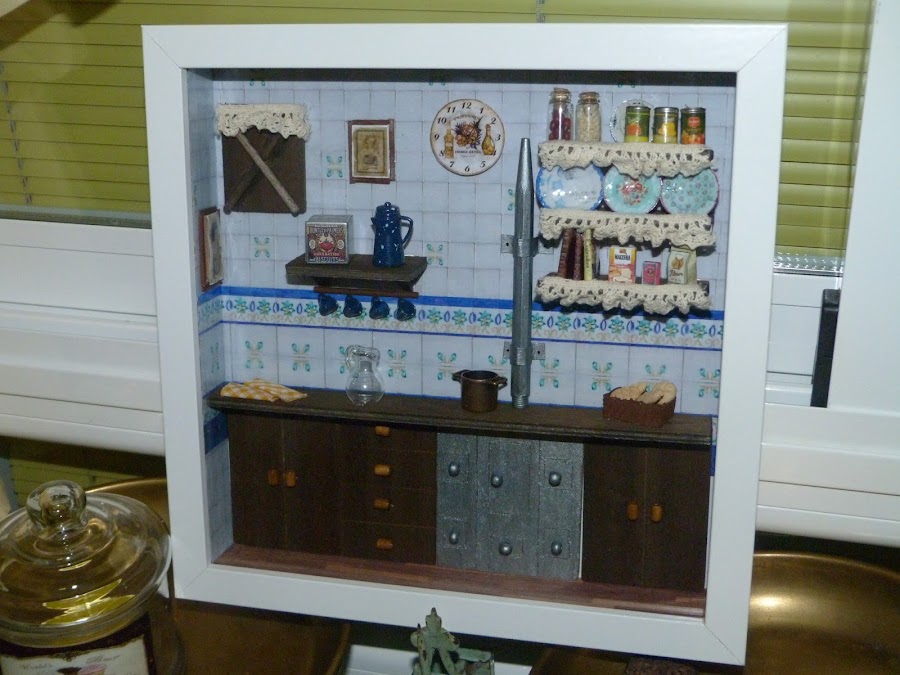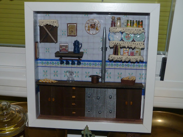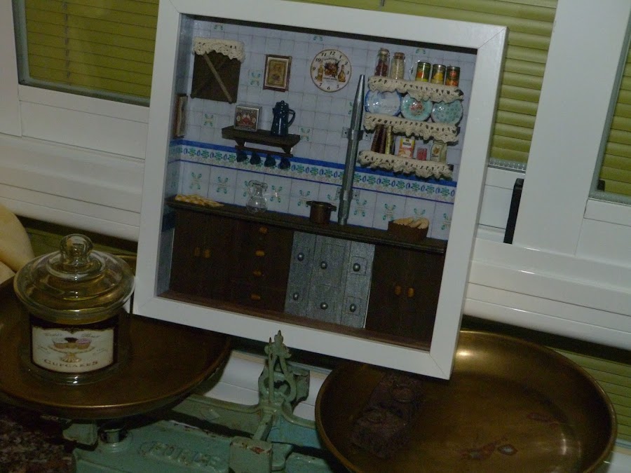 De vez en cuando hago cuadros de estancias en miniatura: cocina, baño, cuarto de costura, etc. La verdad es que no los hago a menudo porque dan mucho trabajo y hay que dedicarles mucho tiempo y tranquilidad. Y como no me sobra ni lo uno ni lo otro, es algo que hago únicamente en ocasiones "especiales". La última vez le había hecho uno a mi madre para la cocina, y a mi cuñada le gustó tanto, que cada vez que va a casa de mis padres, se pasa un ratito mirando el cuadro, fijándose en todos los detallitos.