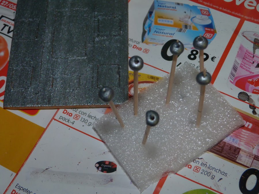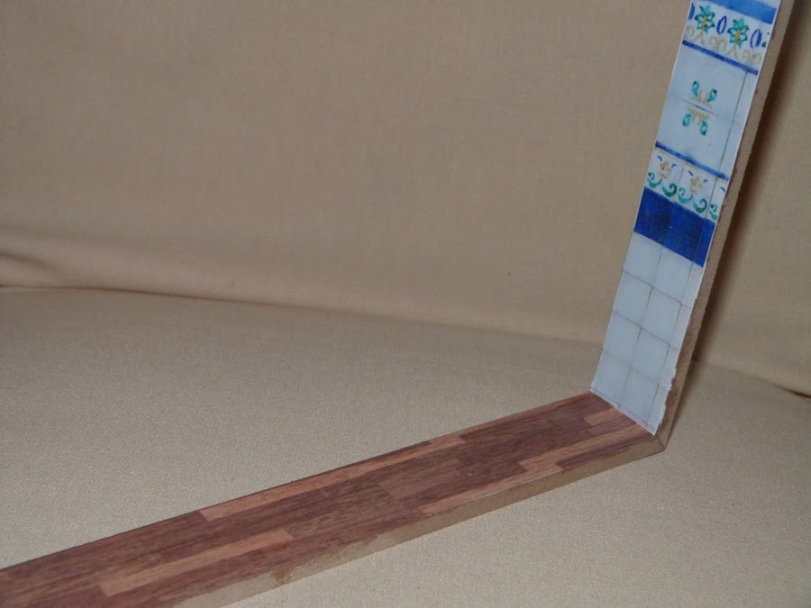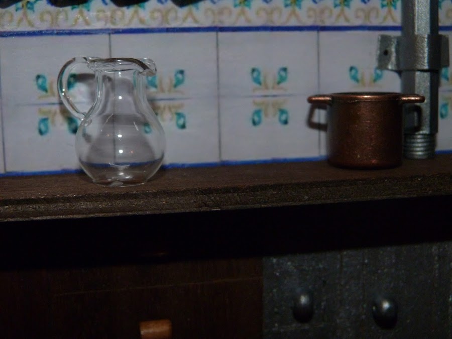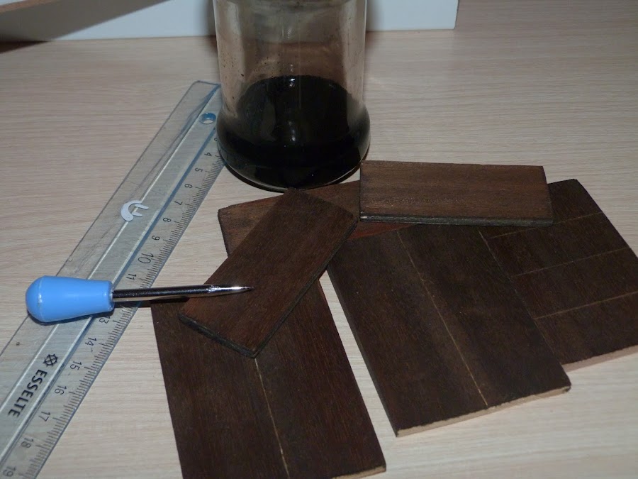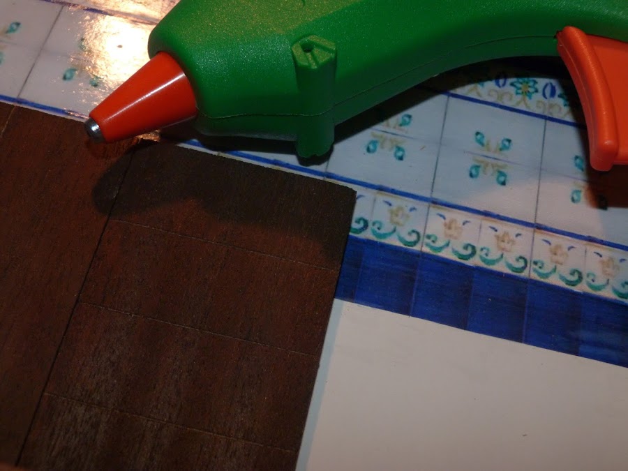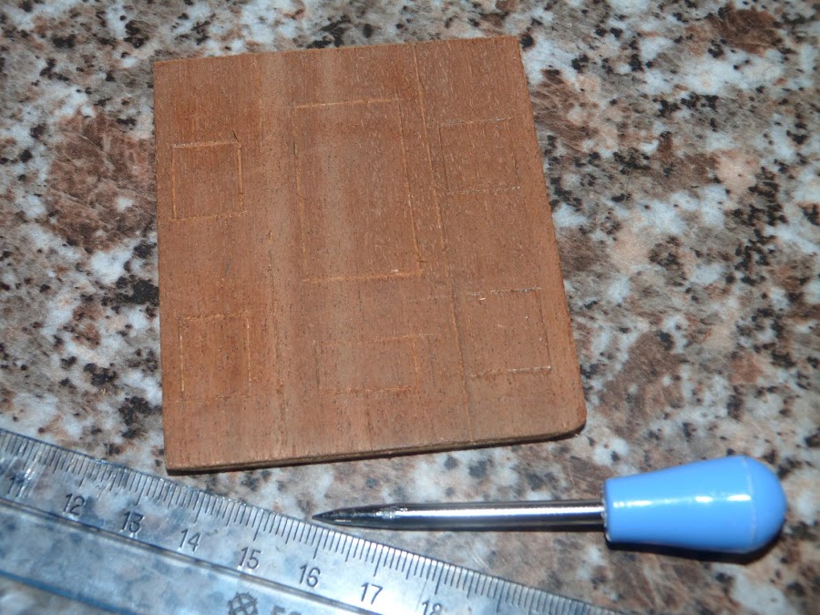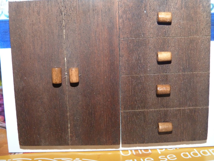 Los muebles, la cocina y la ventana son trocitos de madera cortados a la medida y teñidos con nogalina. Las puertas y cajones los simulo marcándolos con un punzón.