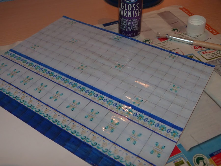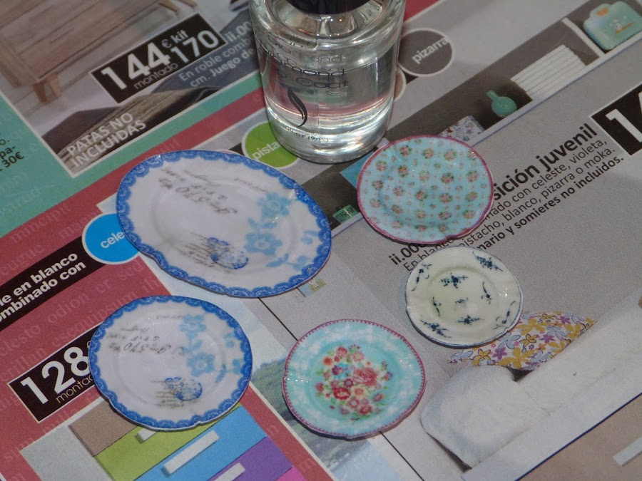 Después, para darles apariencia de loza, los pinto con barniz gloss. Si no tengo, se puede sustituir perfectamente por esmalte de uñas incoloro, el brillito de toda la vida. Por supuesto, el más malo y más barato que encontremos.