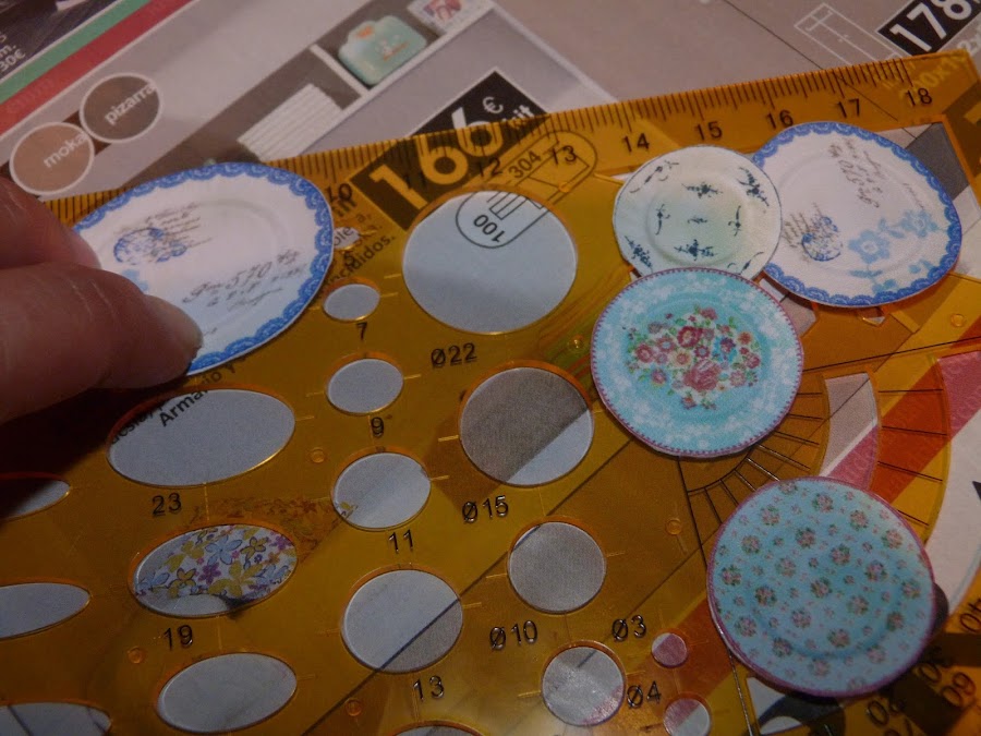 Para darles forma, utilizo esta regla de círculos y óvalos (bueno, y un montón de figuras más que no sé para qué serán). Se pone el platito sobre el hueco apropiado a su tamaño y se presiona un poquito.