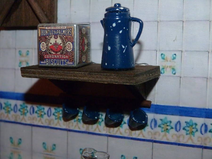... y el juego de café ni os cuento. De hecho, tuve que poner unos soportes (no sé si se aprecian bien en la foto) a este estante para que soportara el peso de la cafetera y la lata de galletas, porque lo pegaba con la pistola y al rato se me caía... Las tacitas están colgadas de una barra (trocito de palo de brocheta).