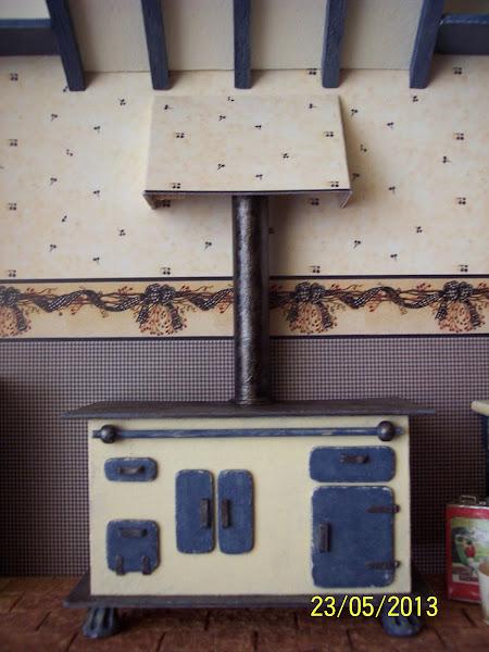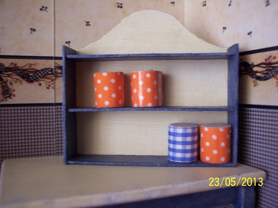 Es una escena en una caja de vinos y está hecha en gran parte a base de reciclado, la cocina y la campana son de cartón y el tubo de plástico blanco pintado. El fregadero lo he hecho con madera de balsa y también cartón, cubierto de gesso y luego dos capas o tres de barniz cerámico, el grifo lo forman un alambre metido en escubidú y unos pendientes que tenía por ahí guardados y que nunca usé jaja, creo que ha quedado chuli. Los estantes son de madera de una caja de fresas, de ahí que en un lado de vea que está combado, no importa por que ya sé que haré ahí jejejeje y la estanteria también es de cartón, no está terminada, pero quería que la viéseis támbién.