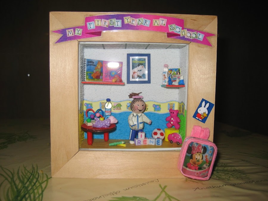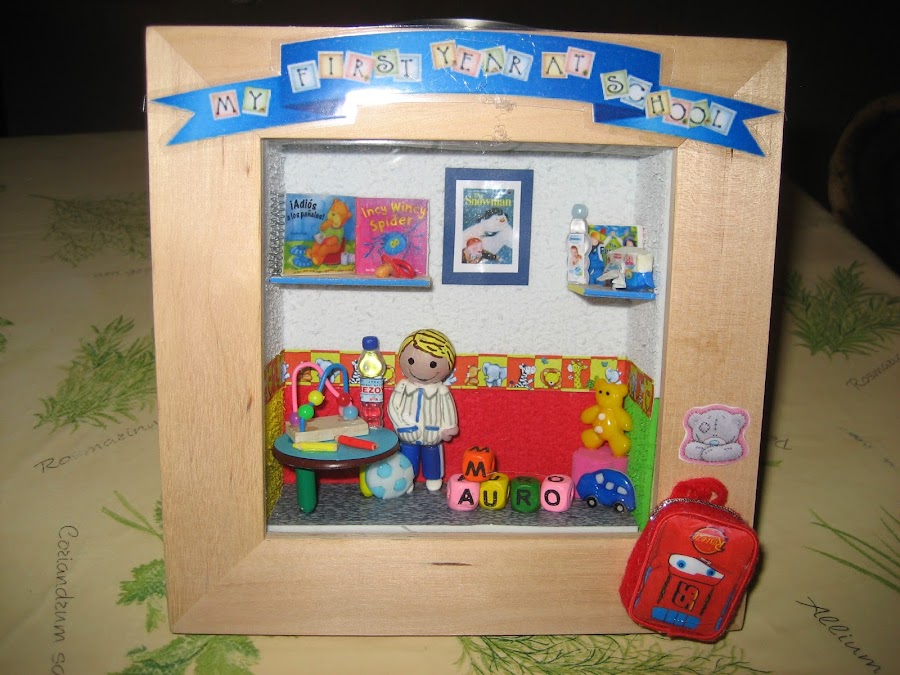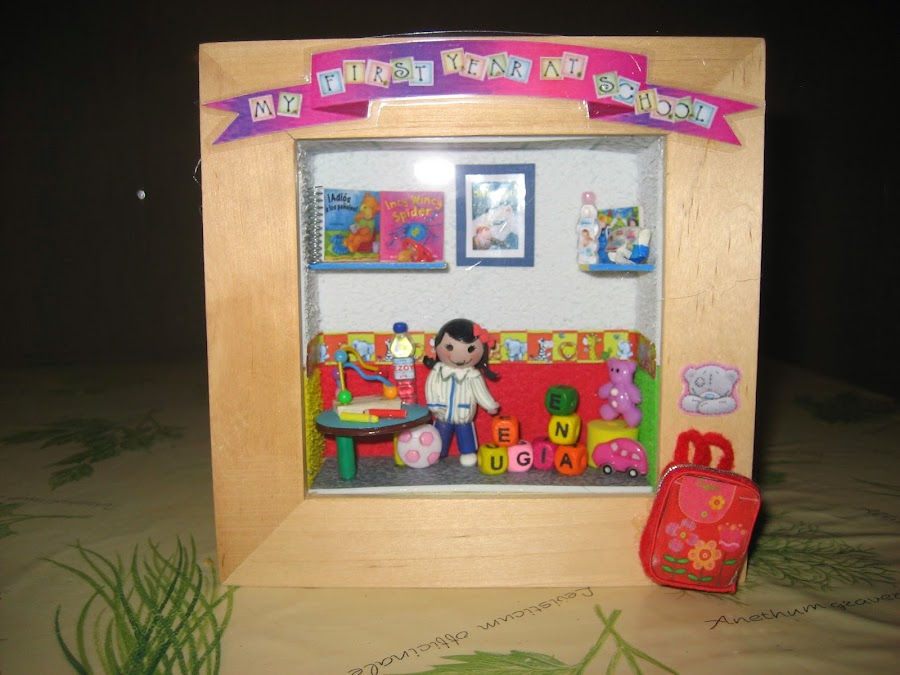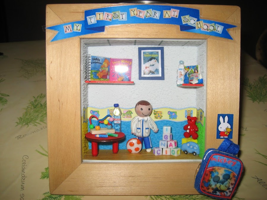 Por último, sobre el marco de cada mini escena, he puesto un letrero que dice MY FIRST YEAR AT SCHOOL, Mi primer año en el cole, y el icono del nombre de su clase, Bunnies (conejitos) y Teddies (ositos)., y he pegado en una esquina la mochila que han usado durante el curso, a cada una la suya. Quería agradecer a mi amiga Mariaje su inestimable ayuda con las mochilas, sin ella no habría podido acabarlas. Gracias, Mariaje!
