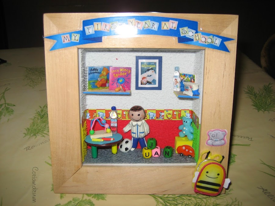 Son unos niños muy especiales para mí, y he querido que recuerden siempre su primer año de cole. Los he imaginado con su babi y el uniforme del cole Todos tienen en su escena una mesita con lápices, un juego de madera y bolitas y una botellita de agua.
