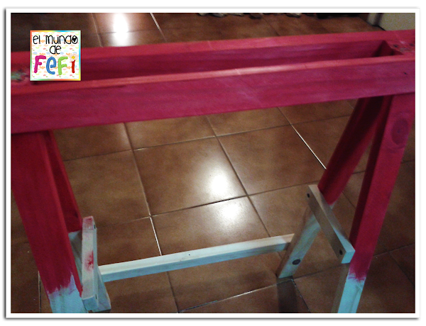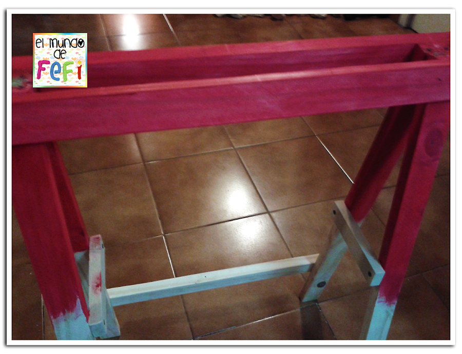 A los estantes, les dí una mano de acrílico rojo y los decapé en acrílico blanco, para hacerles un efectos contrario a la parte superior del escritorio!