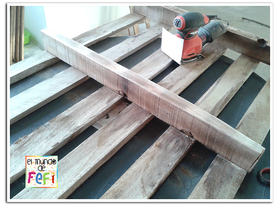 En primer lugar, tuve que limpiar muy bien la madera, cepillándola con un cepillo de cerdas duras, ya que, como suele suceder con estos rudos palets, permanecen bajo agua, tierra y sol por bastante tiempo, ya que no se suelen guardar bajo techo. Luego, corté a la medida que quería mi escritorio y quité las tablas de un lado, y empecé a lijarlas bien, cuanto más suaves queden, mejor será el resultado, así que hay que dedicarle buen tiempo a nuestra amiga la lijadora...
