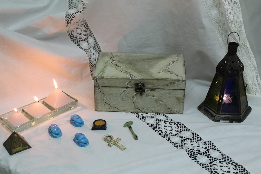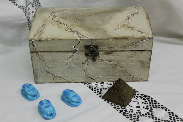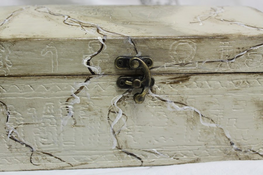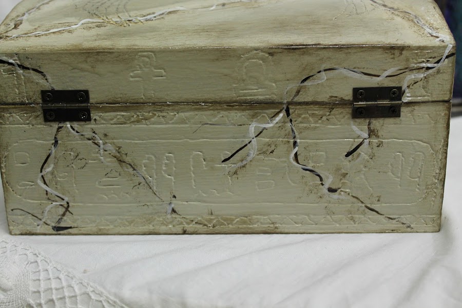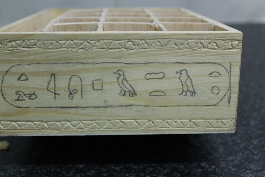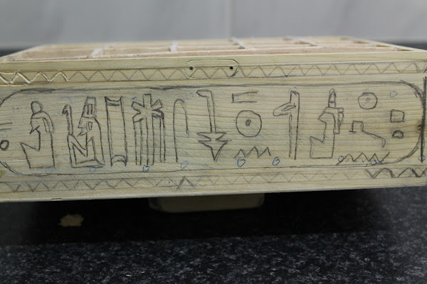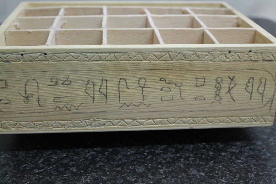 No sabía muy bien cómo hacer la caja y mirando fotos de jeroglíficos pensé porque no gravarlo en la caja y me puse manos a la obra y jolín cuesta un poco y muchas horas , pero ahí está , la pena es que en las fotos apenas se aprecian los grabados , de cerca quedan muy chulos
