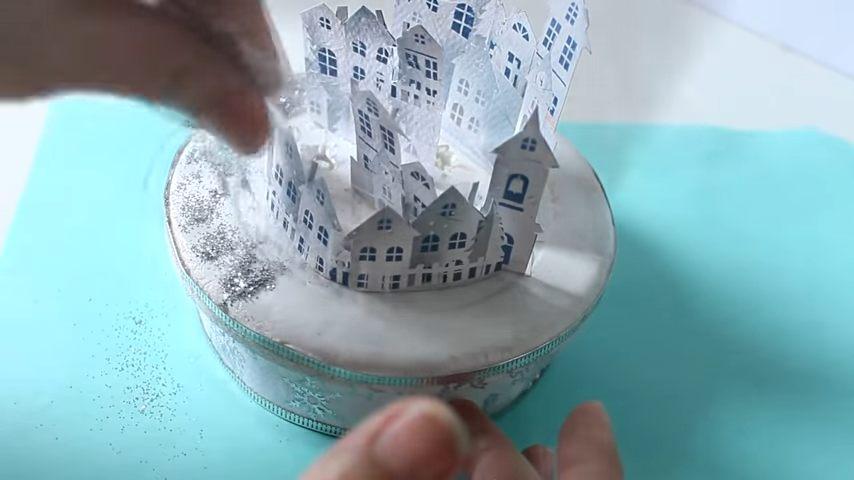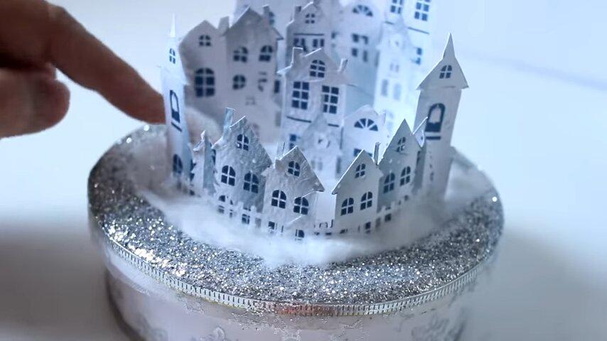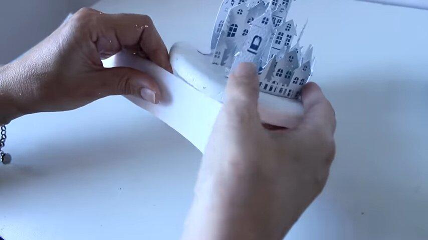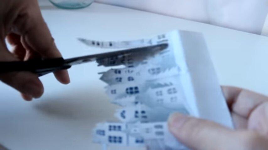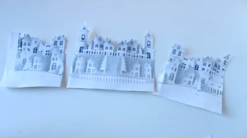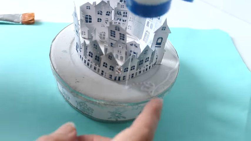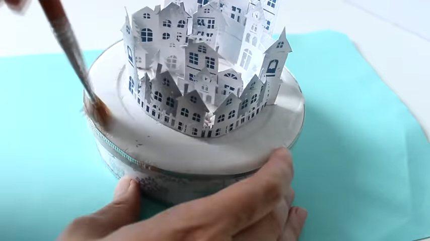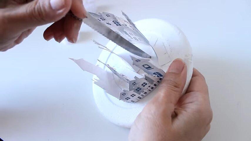 la primera fila de casitas les voy a hacer estos cortes para que se adapten mejor a la forma curva de la base y la voy a pegar con silicona dejando un pequeño espacio entre la figura y el límite interior de la tapa para que no quede muy pegada contra el vidrio cuando coloque la esferay de la misma forma voy a ir pegando el resto de las imágenes haciendo los diferentes niveles y a la última le voy a hacer los mismos cortes que a la primera para poder curvar la también un poquito
