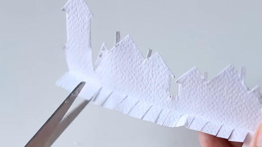 ahora voy a recortar esta primera fila de casitas para que sea la más baja porque quiero que queden tres niveles de alturas una baja que es la delantera una mediana que va a tener dos grupos de casitas y una alta que será la última ya todas las partes también las voy a doblar para hacerles la base de apoyo
