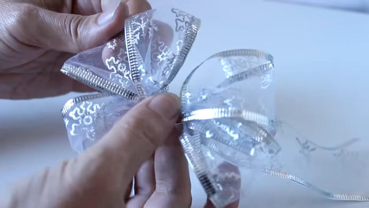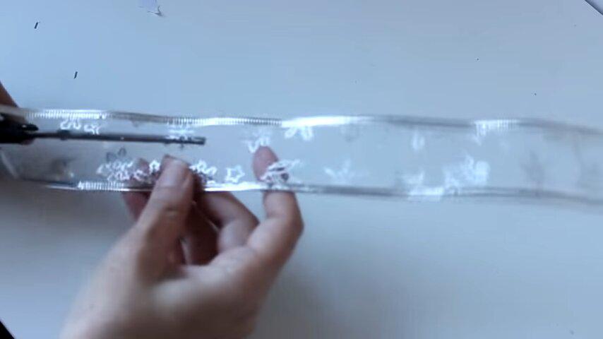 como decoración también voy a utilizar la misma cinta que antes que voy a doblar de esta manera atar en el centro con uno de los márgenes de alambre de otro pedacito que se me había roto y voy a abrir que el moño de esta manera