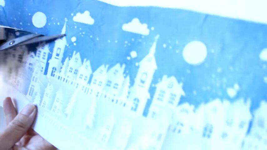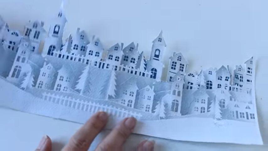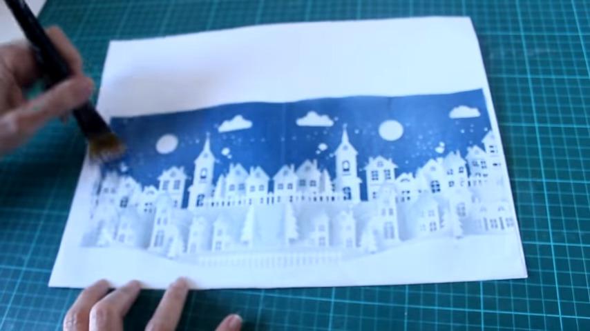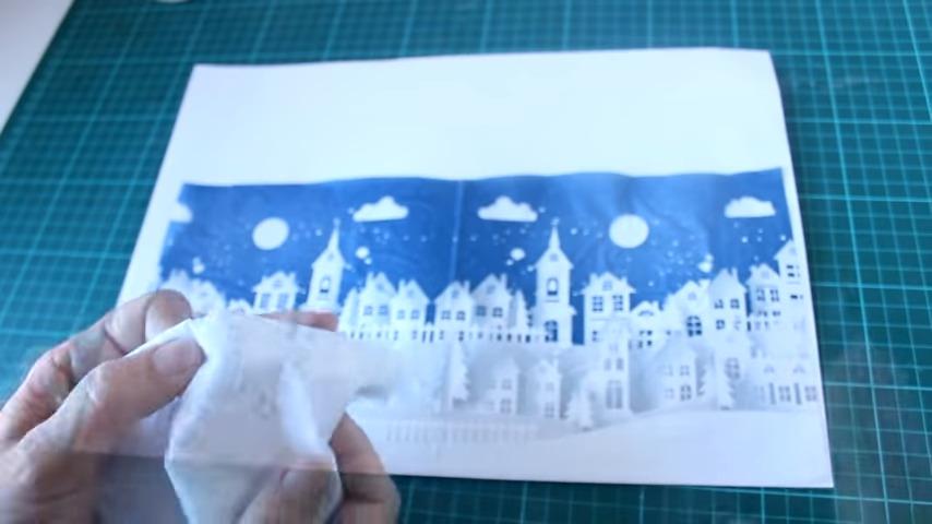 con las partes blancas que me sobraron de la servilleta voy a ir pasándole por encima desde el centro hacia los bordes lo puedo hacer de esta manera porque coloqué muy poquito pegamento pero si ustedes prefieren y se sienten más seguras pueden colocar encima un plástico para me voy a esmerar en que quede bien lisa la servilleta en la parte de las casitas y no me voy a preocupar si queda alguna arruga en la parte superior donde es el cielo