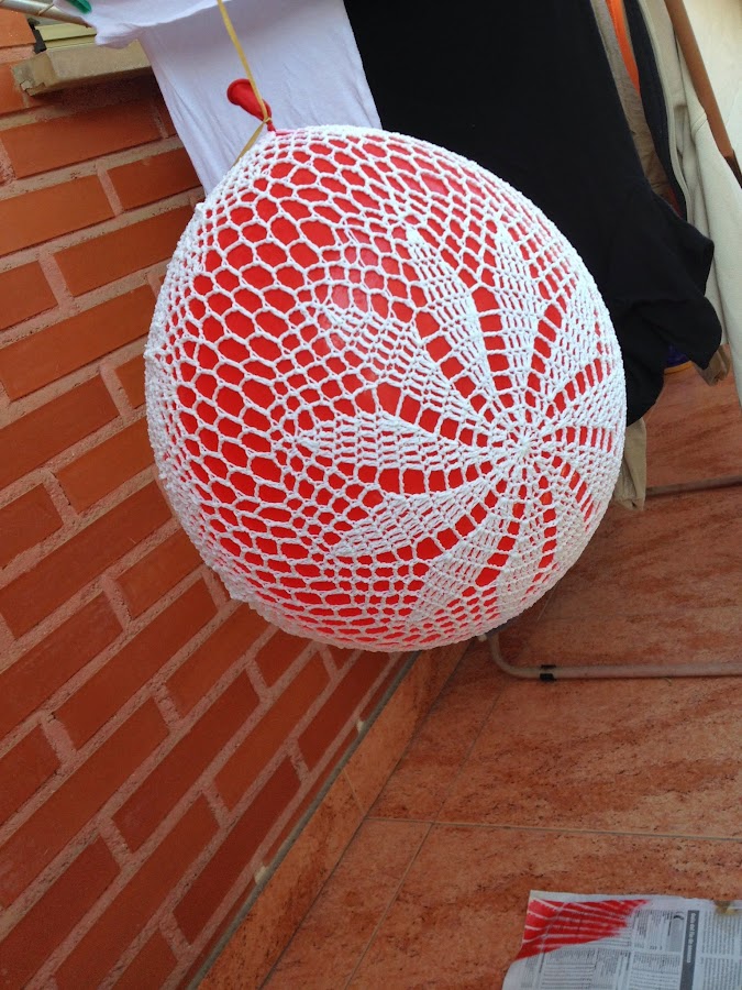 El resultado ha sido mejor en el que lleva solo dos aplicaciones: en este, cosi con hilo las aplicaciones por los bordes, totalmente y una vez hecho se mete entero en la mezcla endurecedora y se escurre un poco. Introduces un globo por uno de los calados del tapete y vas inflando hasta que está redondo. Se pone un hilo al globo y se cuelga a esperar que seque.