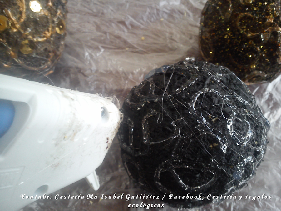 Con la pistola de silicón hacemos algunos relieves alrededor de las esferas...