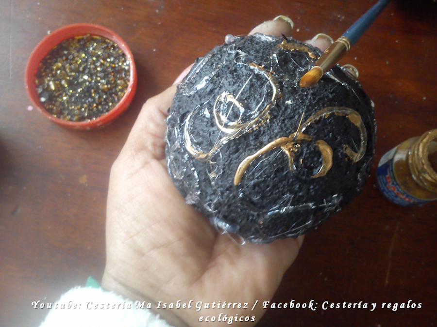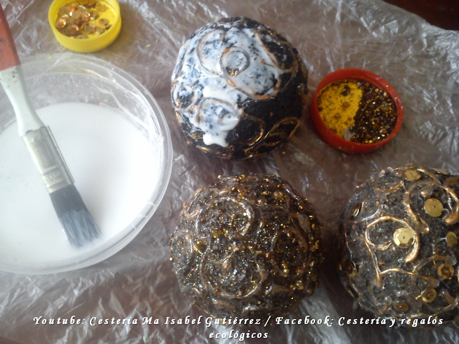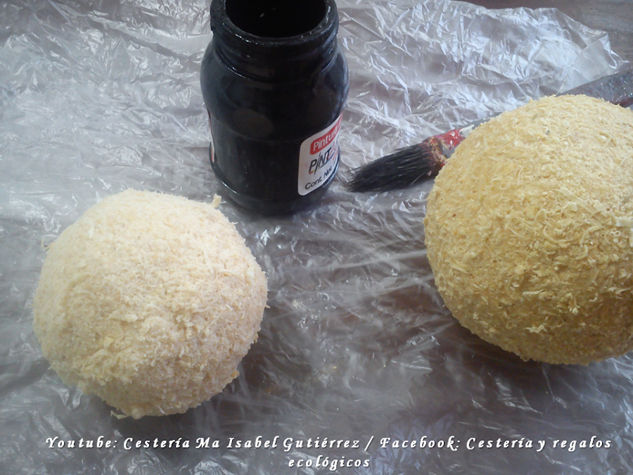 Con nuestras manos, formamos las esferas, verán que es muy fácil moldearlas y salen muy redondas. Dejamos secar por todo un día, se pondrán duras y el color se acentúa... ya que estén bien secas, pintamos con pintura acrílica o vinílica, yo lo hice en color negro...
