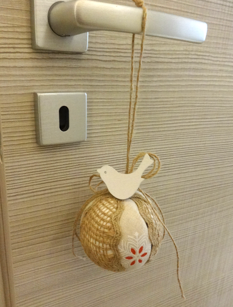 Este es el resultado, creo que un moño de listón rojo en tela de algodón daría más color y vistosidad a la esfera, así como cascabeles para que tintineen al abrir y cerrar las puertas. Solo sugiero una esfera de diámetro mayor para dar más vistosidad a las puertas de las recamaras de los peques