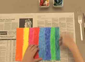Pinta el soporte escogido con las ceras de colores, cubriendo todo el soporte de distintos colores.