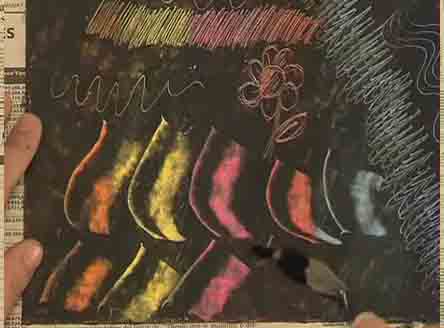 Una vez cubierta la cartulina, puedes comenzar a esgrafiar, escogiendo cualquier elemento punzante. La idea es levantar la cera negra descubriendo el color que hay debajo. Puedes dibujar con clips, tenedores y espátula.