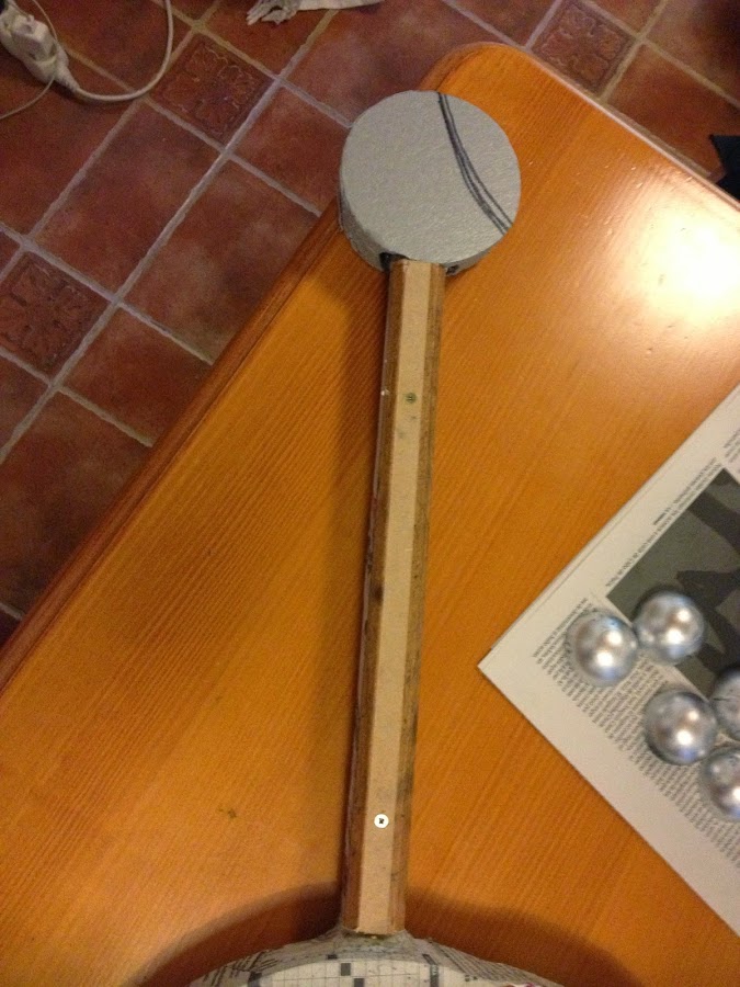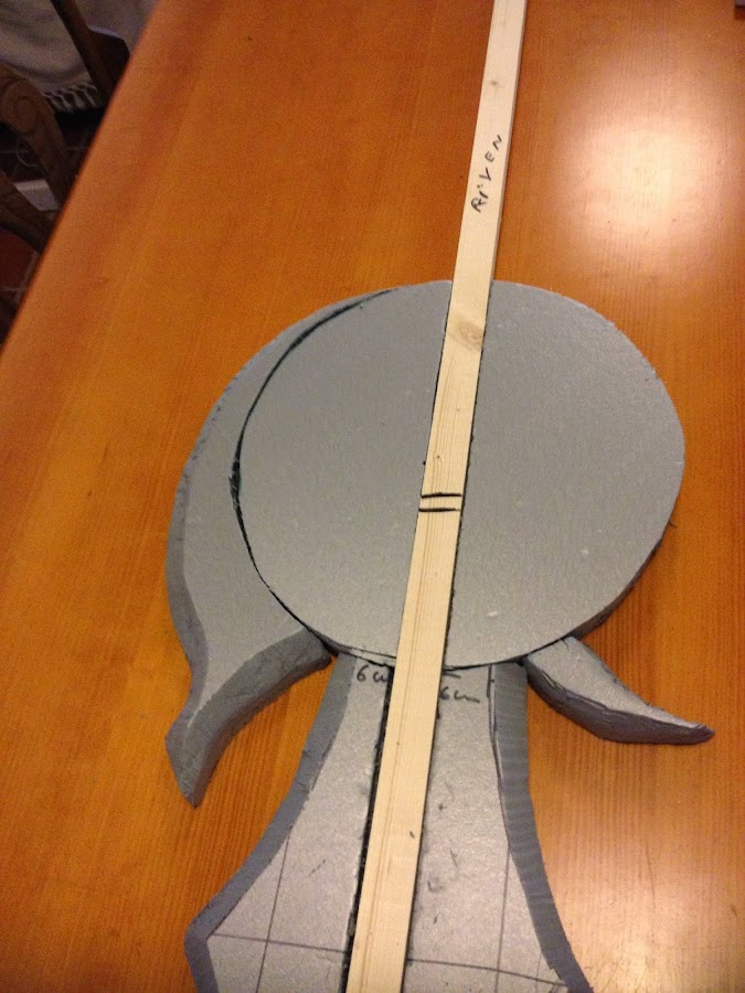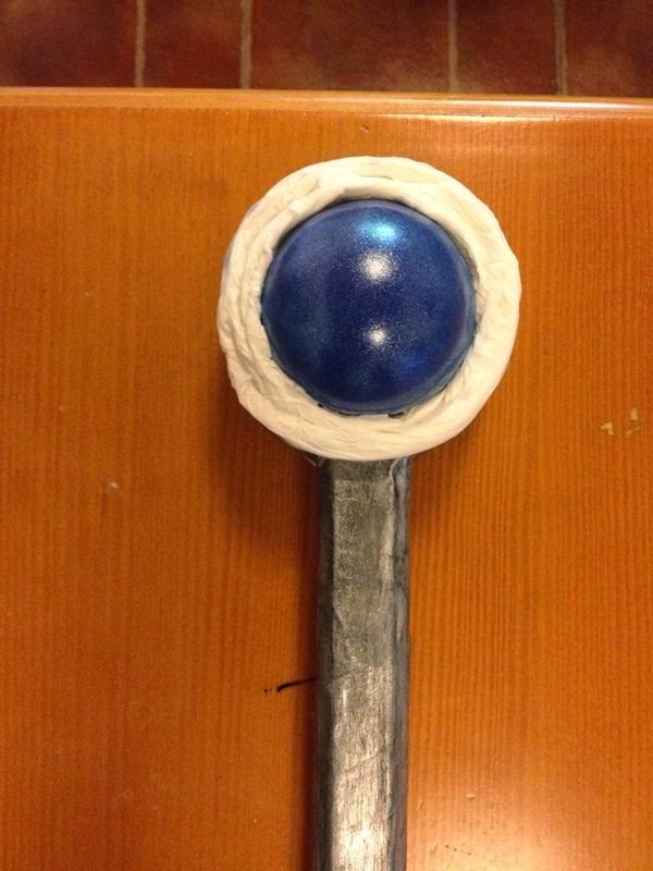 La empuñadura se ha recubierto con goma eva, se cortan tiras largas, de 2 cm de ancho y se van enrollando y fijando con ayuda del pegamento caliente.
