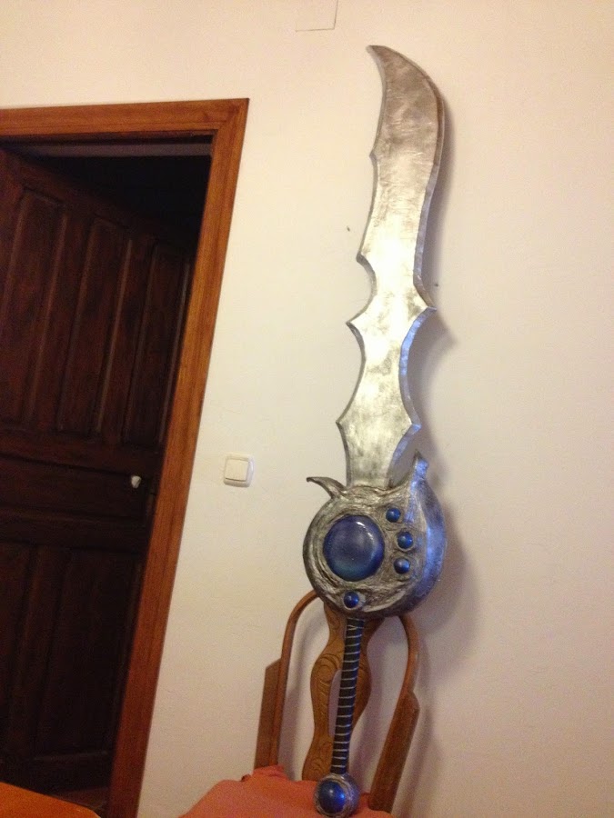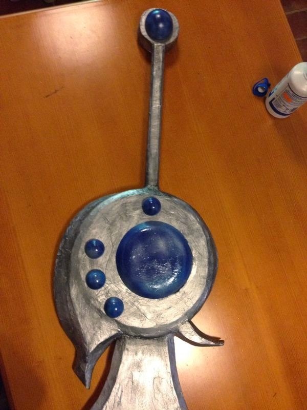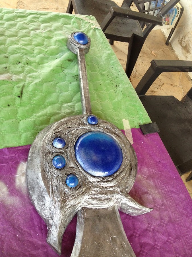 Tras ponerlas en la espada, me di cuenta que no se sostenian, pesan y aunque las pegue con pegamento caliente, se desprenden, para solucionar estoy y tambien para que quedara mas fiel a la original, con papel de cocina mojado en una mezcla de agua y cola blanca, he hecho el adorno de alrededor de las gemas.