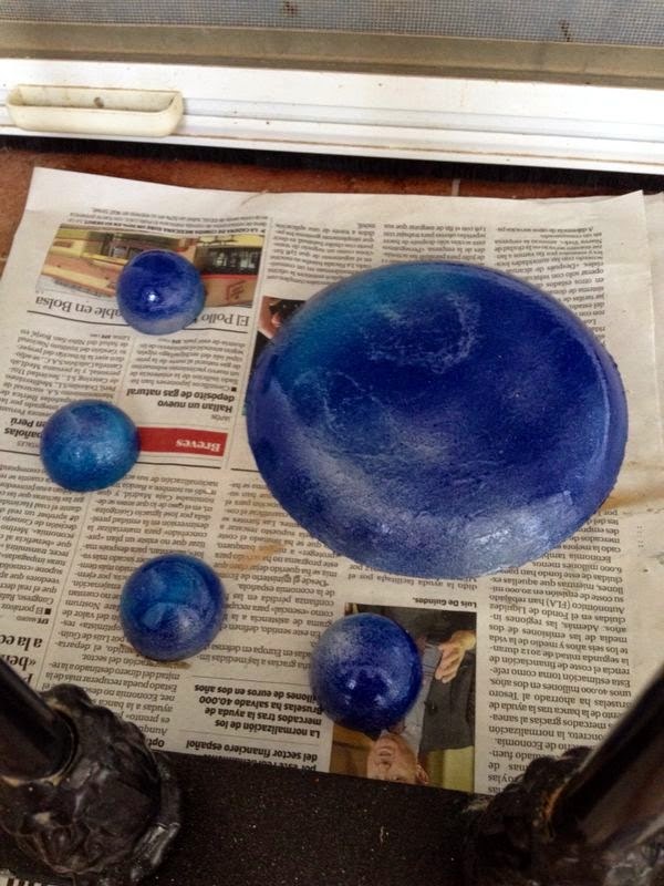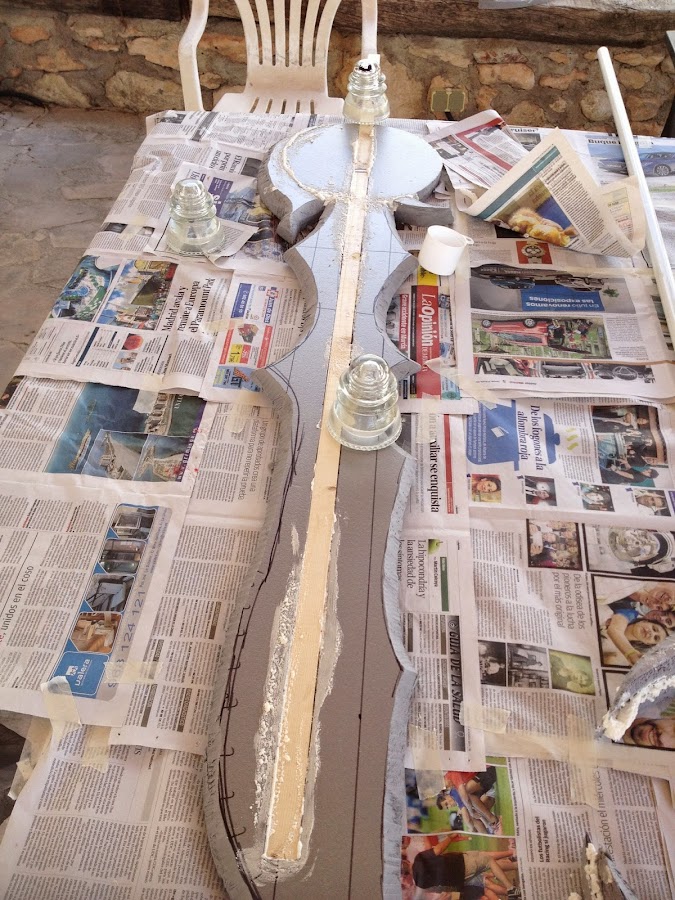 Despues se cubre entera con papel maché (tiras de periodico mojadas en engrudo), para igualarla y para que se pueda pintar, puesto que si se utliza pintura en spray sobre el aislante, este se disuelve y no queda bien.