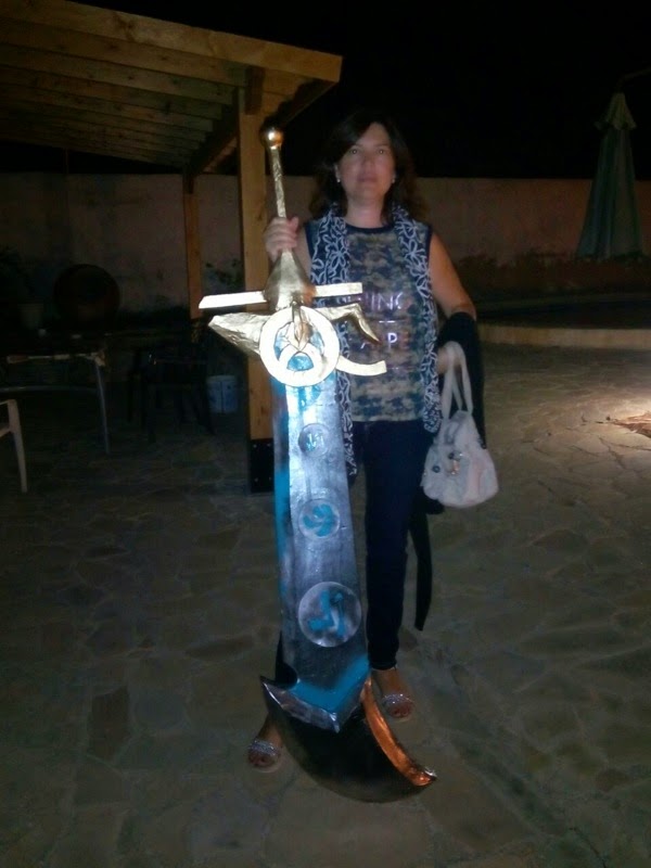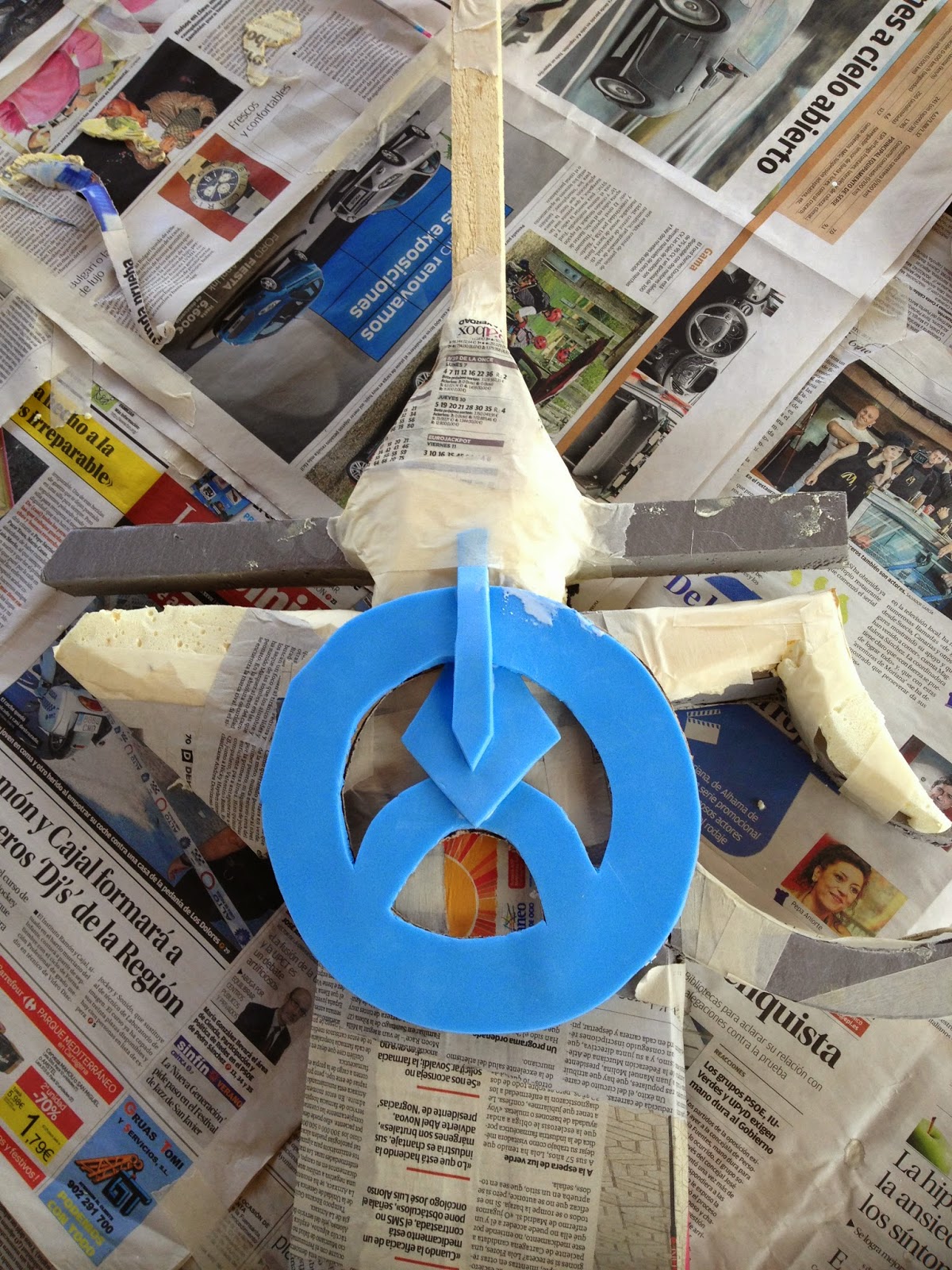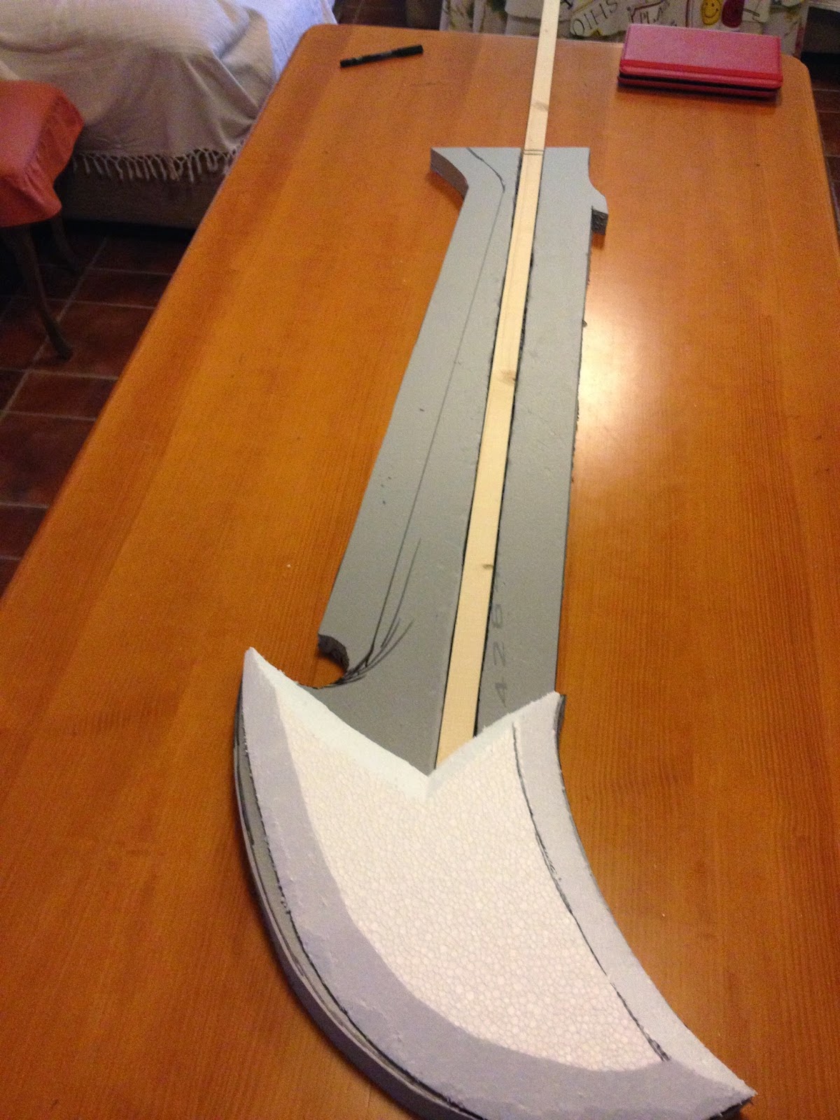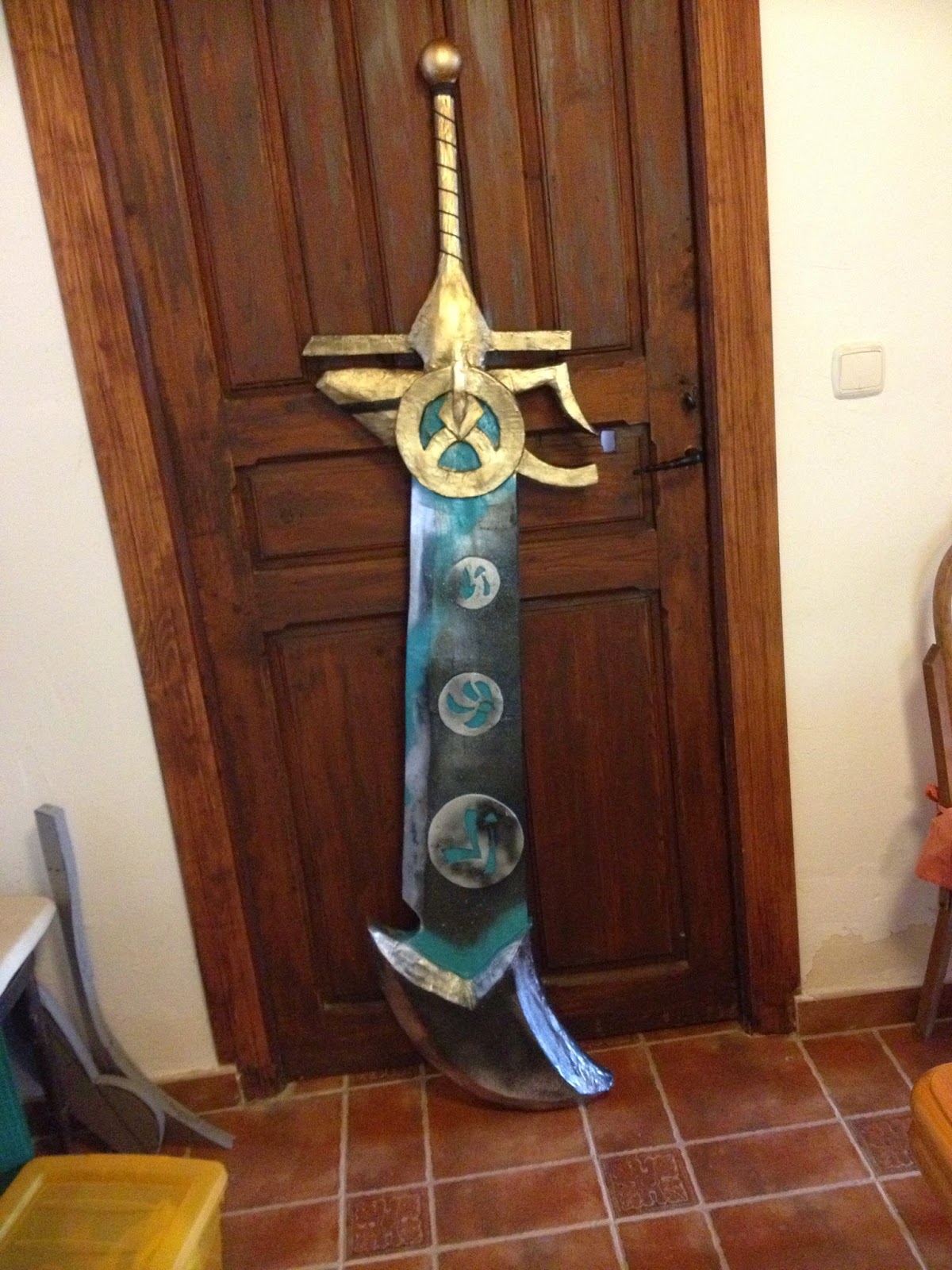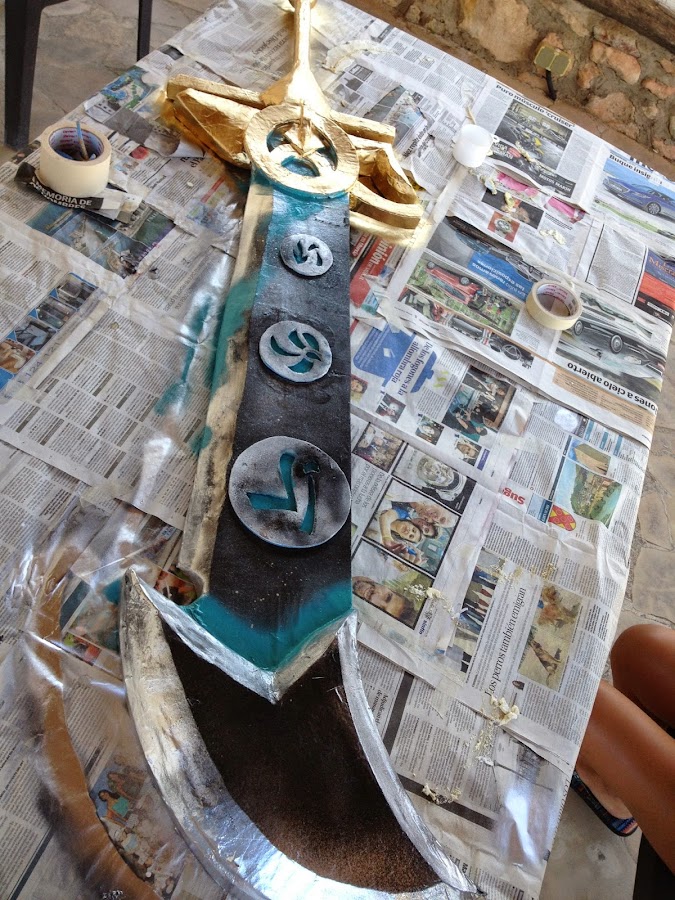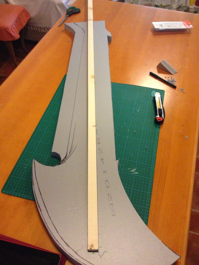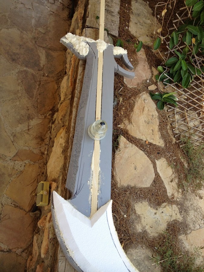 Pongo unas fotos del proceso, está hecha en material aislante, con una barra de madera en el centro para darle mas fuerza, la hoja (doble) es de corcho blanco, las runas de goma eva de 4 mm, para unirlo y dar fortaleza, y tambien tallar algunas partes mas complicadas he puesto espuma de poliuretano, despues hay que tallarla con un cuter.