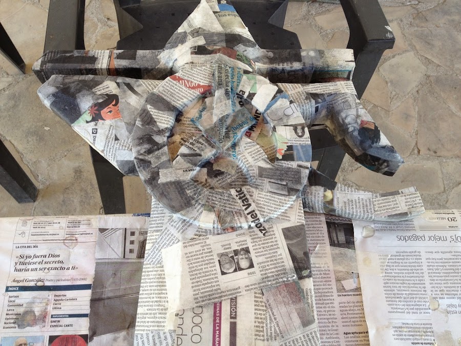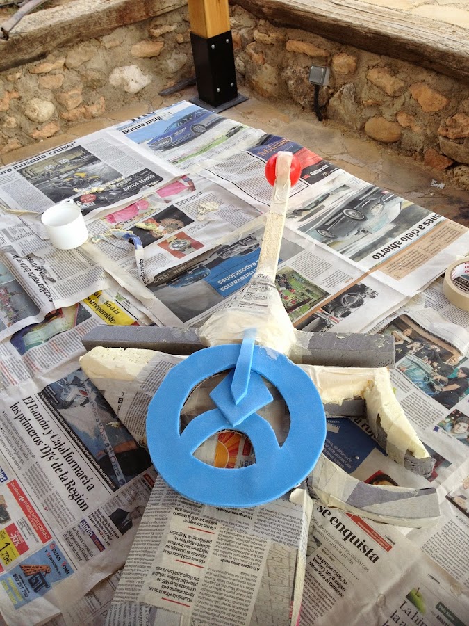Todo se ha recubierto de papel maché (periodico a tiras empapado en engrudo, tambien puede mojarse en una mezcla de cola blanca y agua) una vez seco esta pintado con pintura en spray